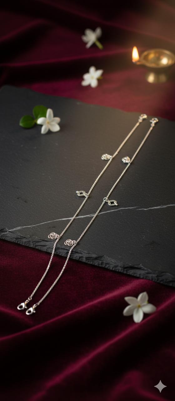 Embrace effortless elegance with this beautifully crafted 925 Sterling Silver Anklet, designed with delicate floral-inspired motifs adorned with shimmering Cubic Zirconia (CZ) stones. The fine silver chain paired with evenly spaced sparkle accents creates a graceful, feminine look that enhances every step. Lightweight and comfortable, this anklet is perfect for daily wear as well as special occasions, adding a subtle yet luxurious charm to your style. A timeless piece that blends minimal design with refined brilliance.