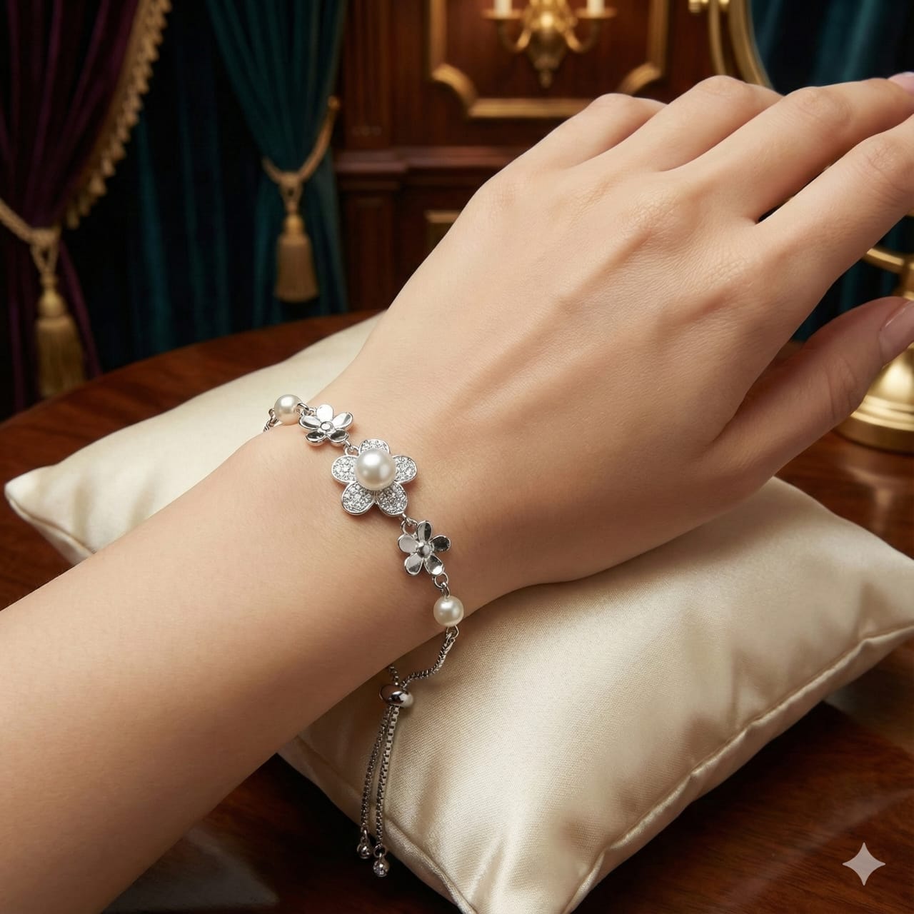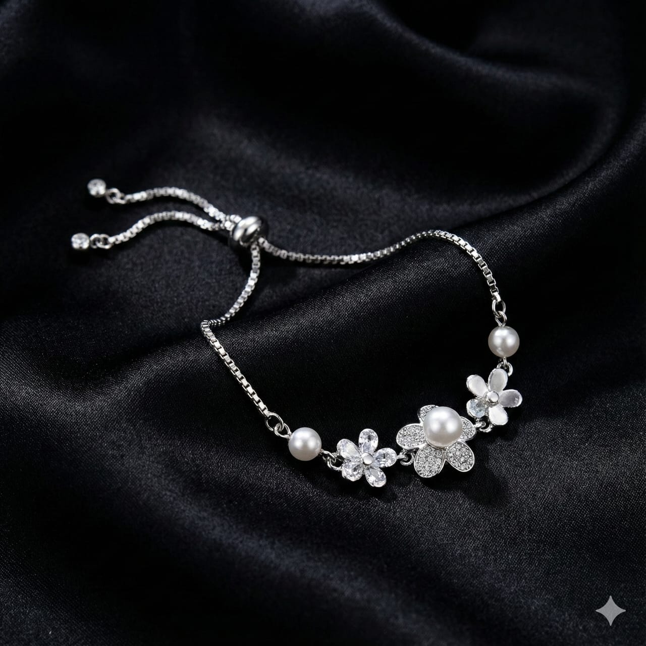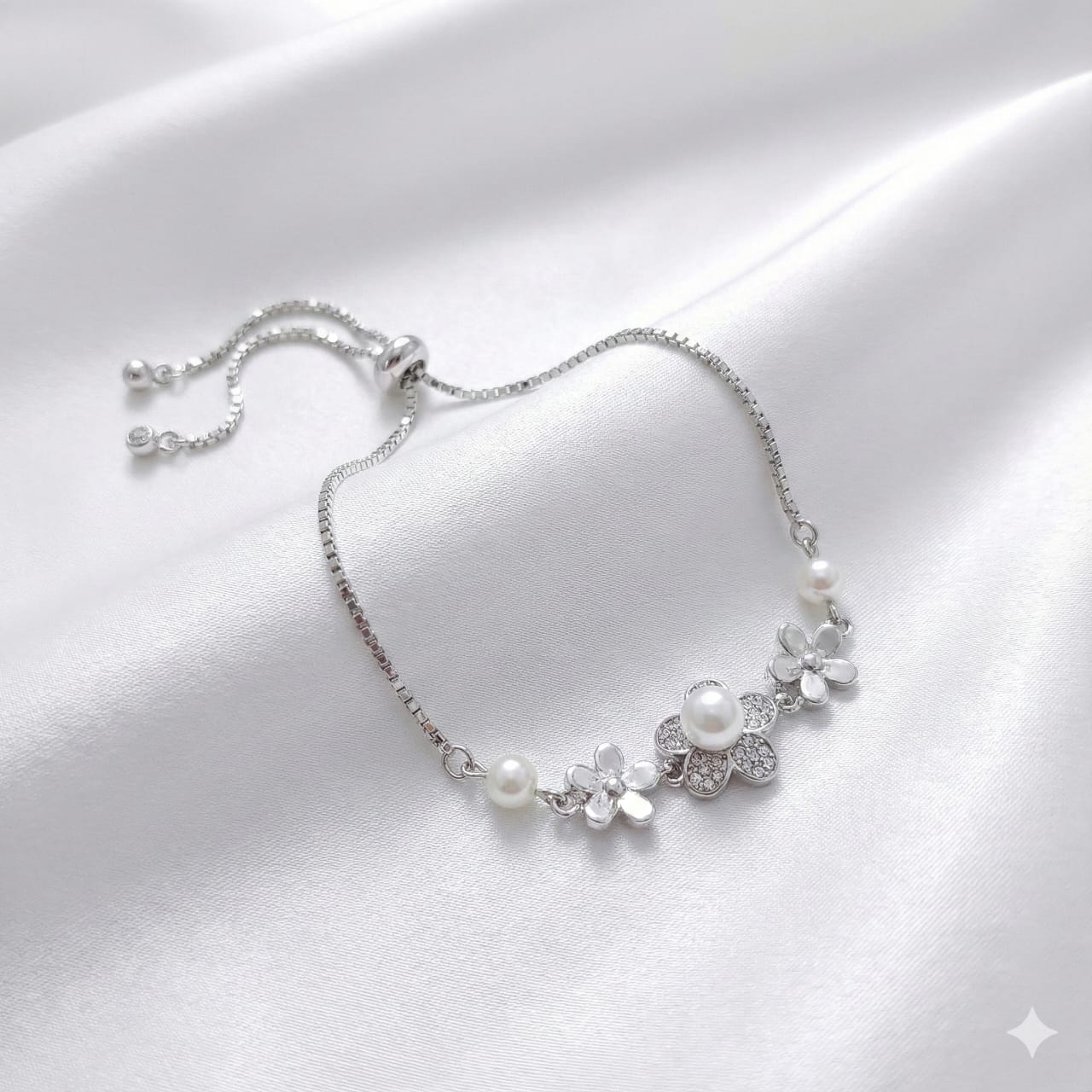 Embrace elegance and charm with this Sterling Silver 925 floral bracelet featuring delicately crafted flowers, shimmering cubic zirconia accents, and luminous simulated pearls. Designed with an adjustable sliding clasp for a perfect fit, this bracelet brings a graceful, feminine touch to any outfit. Ideal for gifting or enhancing your own jewelry collection.