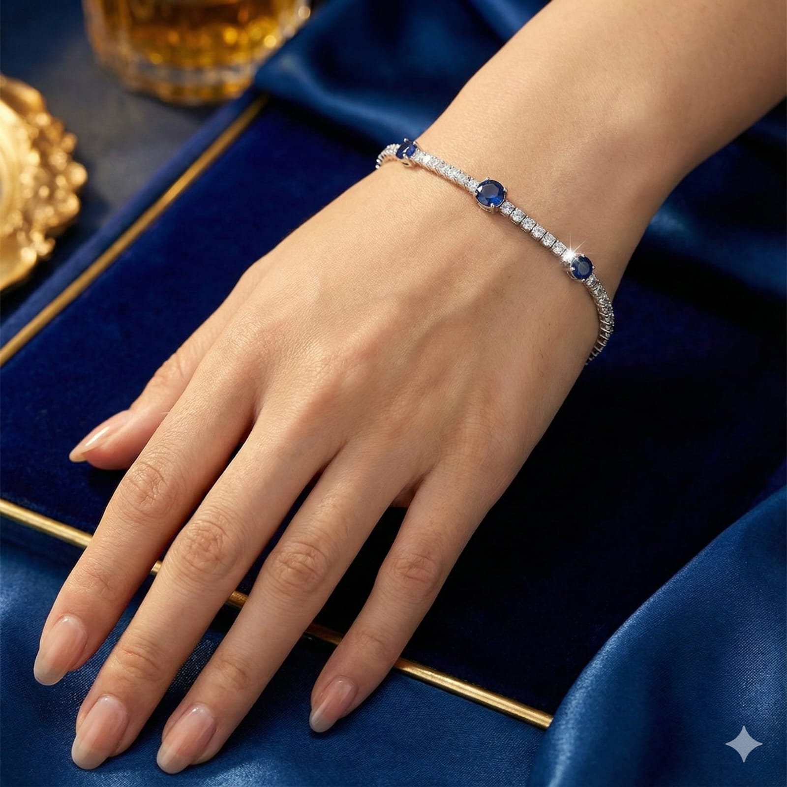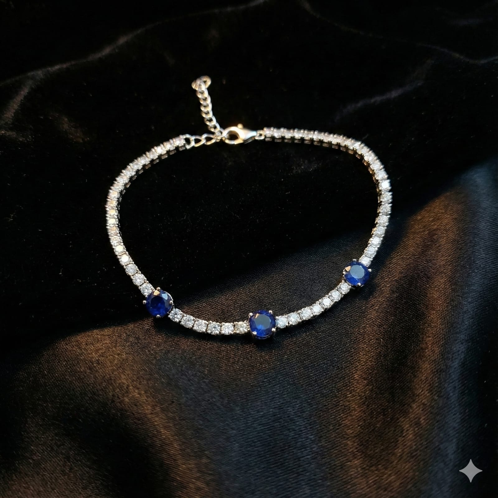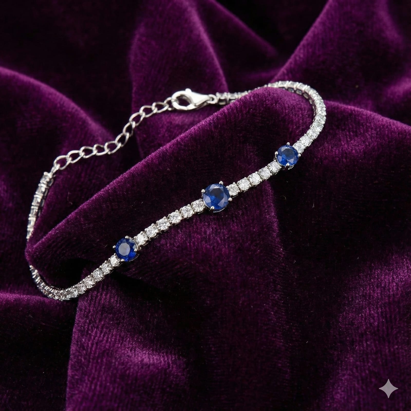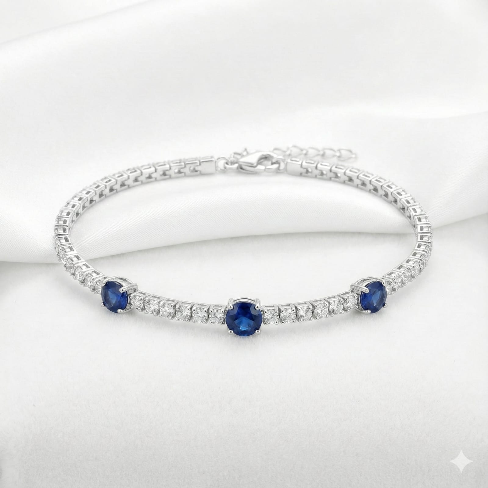 Showcasing timeless elegance, this Sterling Silver 925 tennis bracelet is a luxurious blend of classic charm and modern brilliance. Featuring three striking round-cut blue sapphire cubic zirconia stones as focal points, this bracelet is beautifully accentuated with a continuous row of brilliant white CZ stones. The secure clasp and refined silver setting add comfort and sophistication, making it perfect for both everyday wear and special occasions.