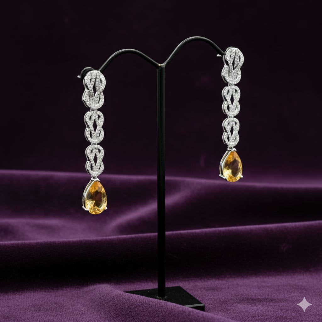 Bring radiant elegance to your jewelry collection with these luxurious 925 sterling silver drop earrings. Designed with a striking yellow teardrop-shaped cubic zirconia stone, these earrings feature a refined series of interlinked pavé-set clear CZ accents that create a graceful, elongated silhouette. The combination of vibrant color and sparkling detail makes these earrings a perfect statement of sophistication. Crafted in premium sterling silver with a high-polish finish, these earrings offer exceptional brilliance, durability, and comfortable wear. Ideal for weddings, evening events, festive occasions, or elegant gifting, they effortlessly enhance both traditional and contemporary looks.