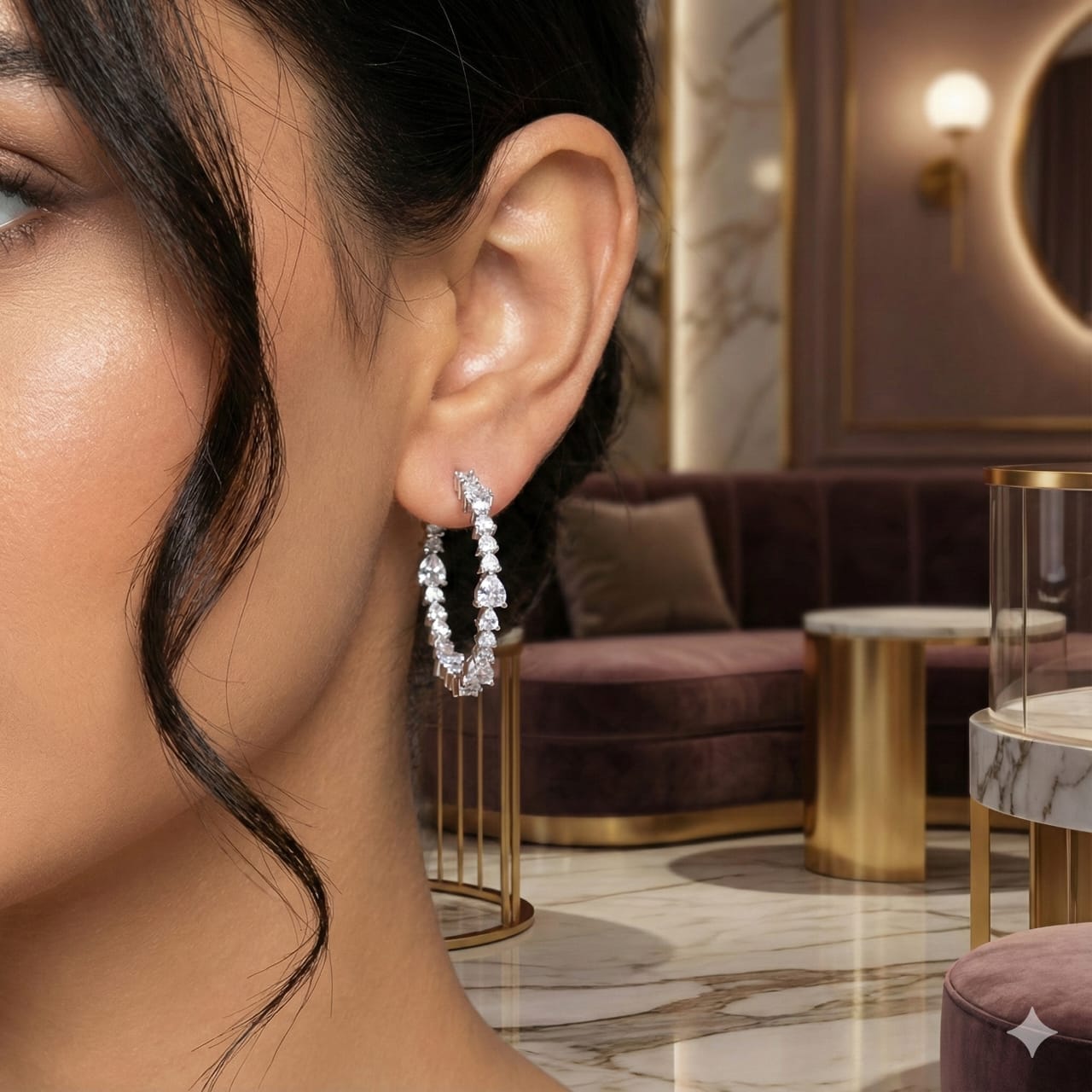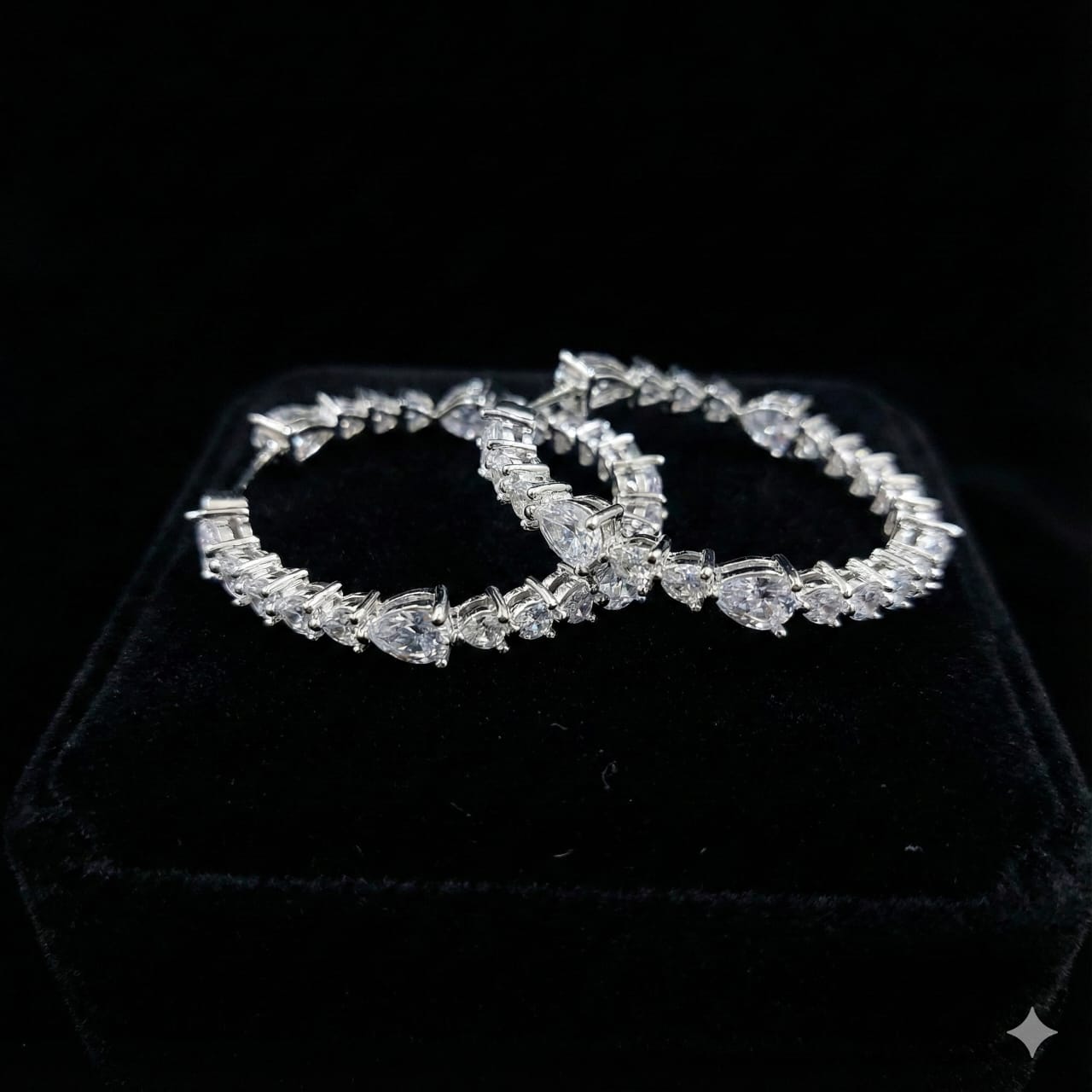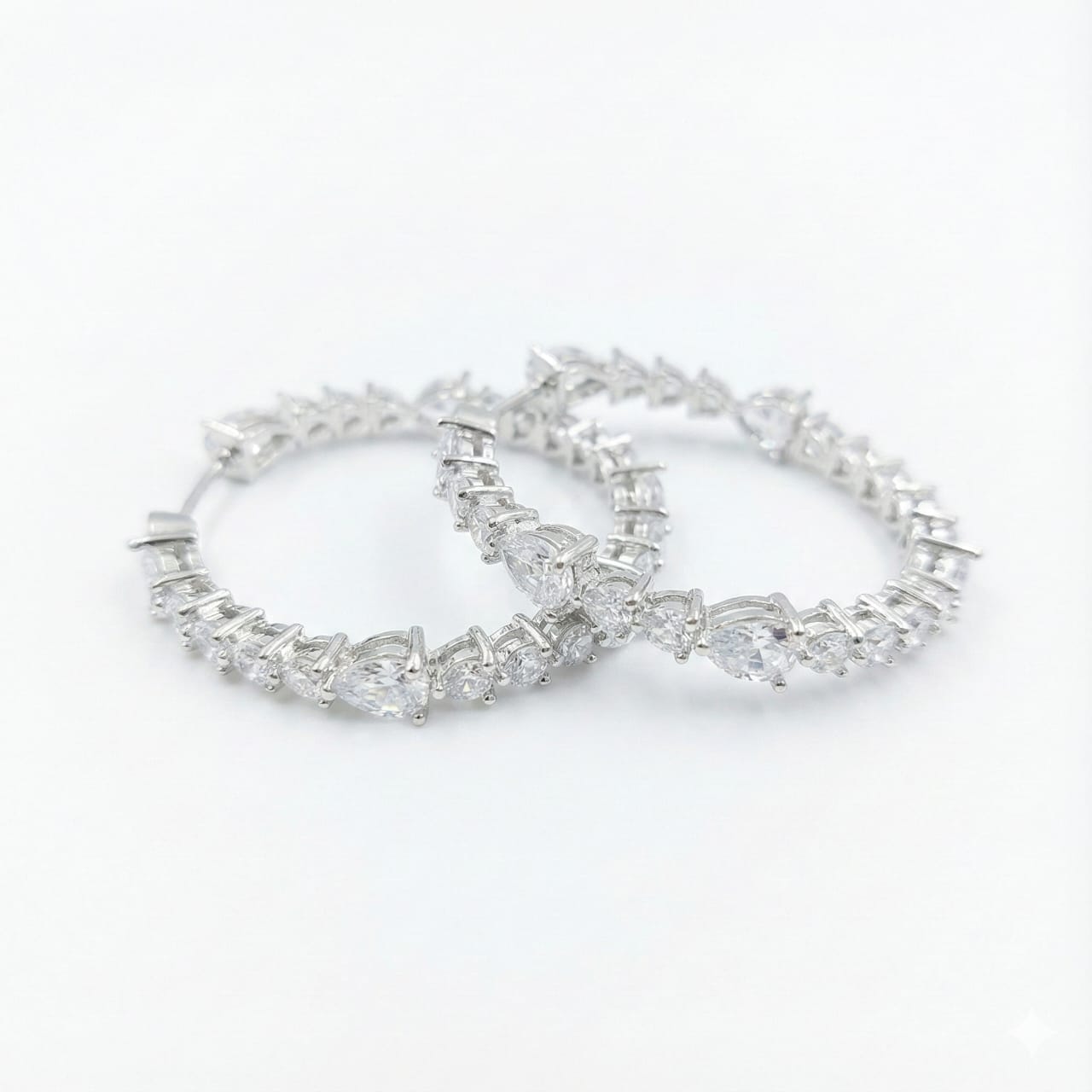 These stunning Sterling Silver 925 hoop earrings feature a dazzling combination of marquise-cut and round cubic zirconia stones for maximum sparkle and dimension. The alternating stone shapes create a luxurious, high-end look reminiscent of fine diamond jewelry. Lightweight and comfortable, these hoops are perfect for weddings, celebrations, night outings, or anytime you want to add elegant brilliance to your style.