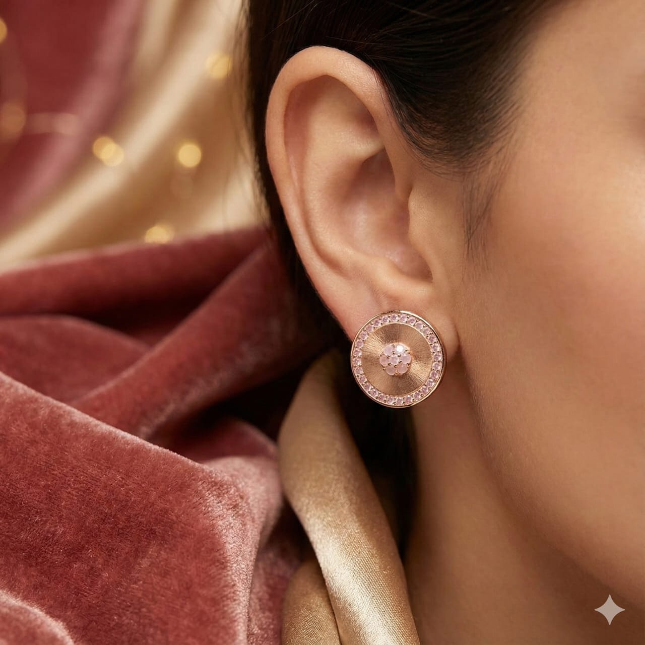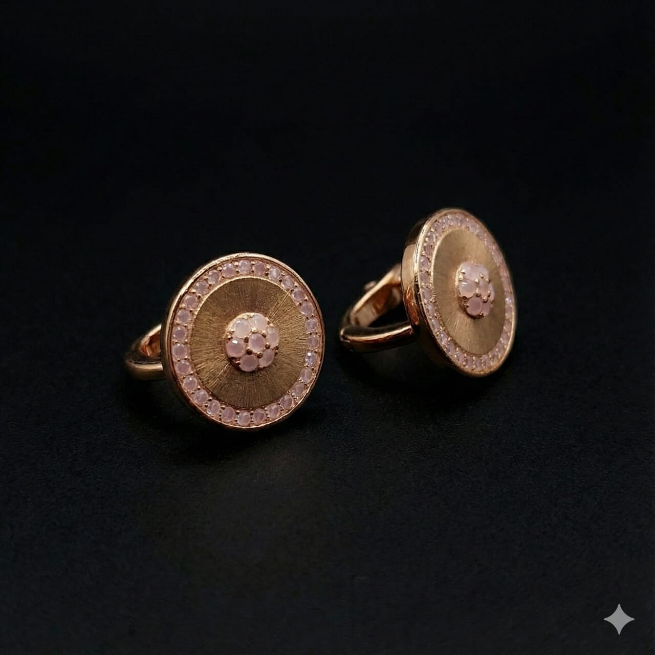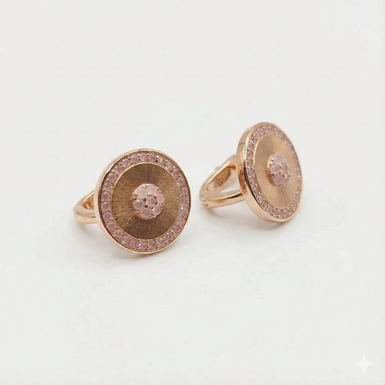 These sophisticated rose gold circular earrings blend elegant modern design with a touch of feminine charm. The center features a cluster of soft pink crystals, surrounded by a brushed metallic finish that adds depth and texture. Encircling the outer edge is a sparkling halo of delicate pink stones, creating a radiant, eye-catching look. Crafted on a silver base with a rose gold finish, these earrings are perfect for elevating both everyday and special-occasion outfits. Classy, stylish, and beautifully detailed—an irresistible addition to any jewelry collection.