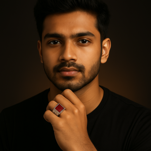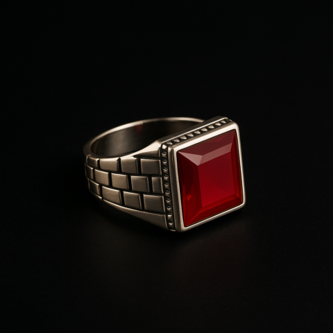 Bold Square Red Stone Silver Gents Ring – Vintage Designer Statement Piece