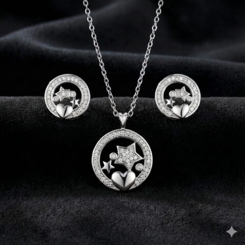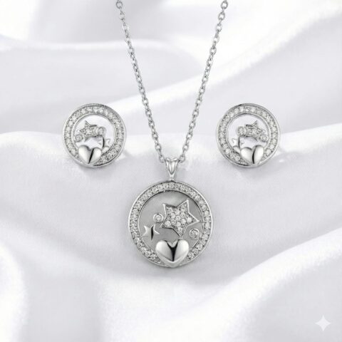 Celestial Heart & Star 925 Sterling Silver CZ Pendant Necklace with Matching Stud Earrings Set