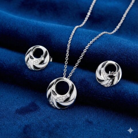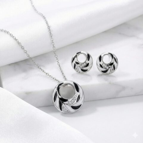 Elegant Swirl Circle 925 Sterling Silver CZ Pendant Necklace & Stud Earrings Set
