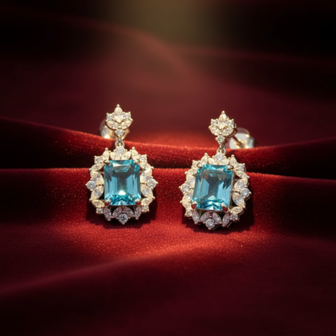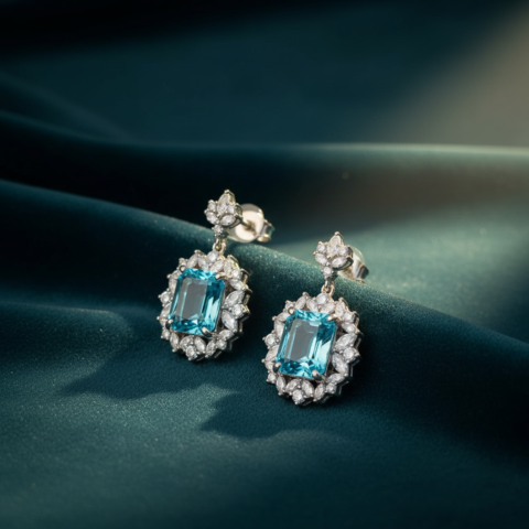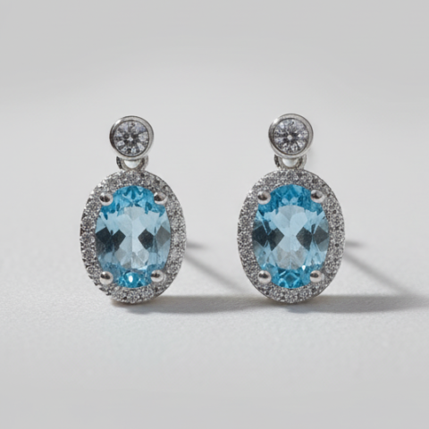 Exquisite Aquamarine & Diamond Halo Drop Earrings in 925 Sterling Silver