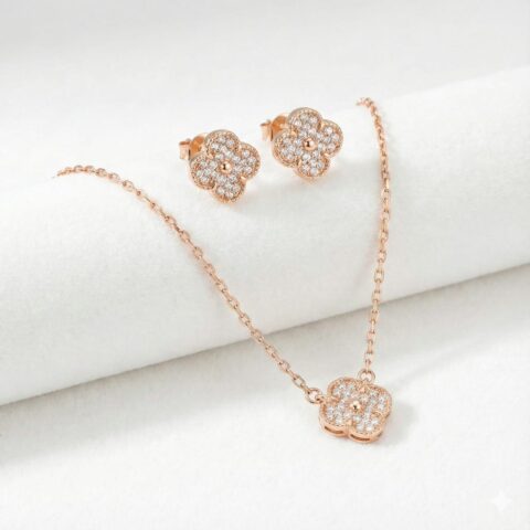 Rose Gold-Plated Clover Necklace & Earrings Set with Sparkling Stones
