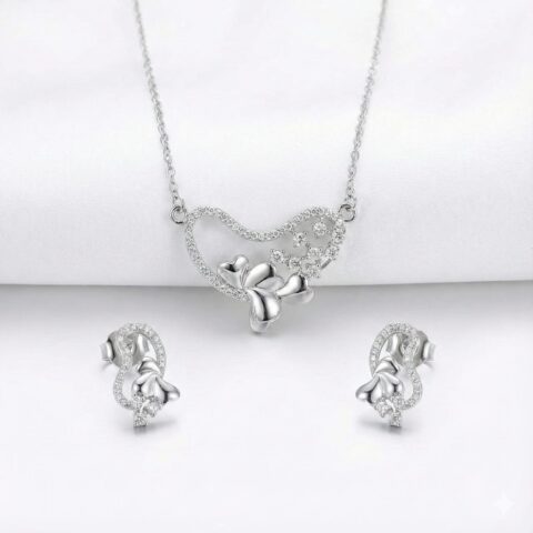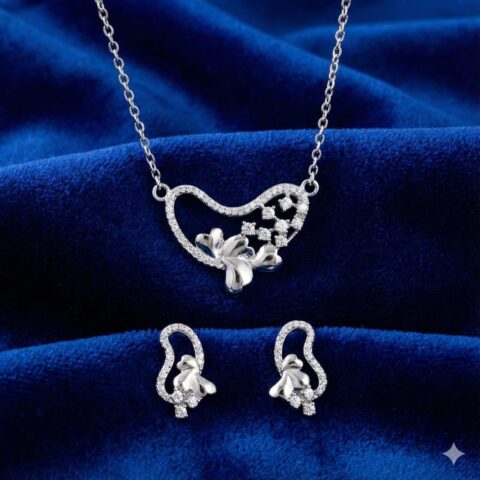 Romantic Heart Blossom 925 Sterling Silver CZ Pendant Necklace & Earrings Set