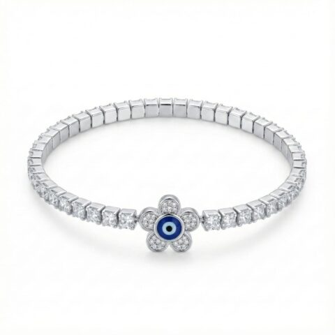 Silver Evil Eye Flower Tennis Bracelet – Crystal-Studded Protection Charm Bracelet