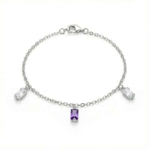 Silver Charm Bracelet with Purple & Clear Baguette Crystals – Elegant Minimalist Dangle Bracelet