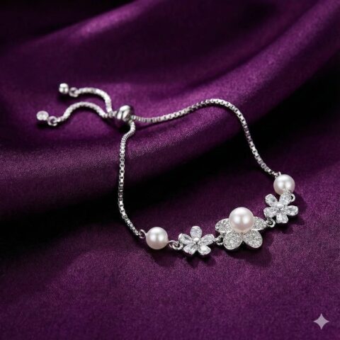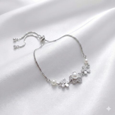 Sterling Silver 925 Adjustable Floral Bracelet with Simulated Pearls and CZ Accents