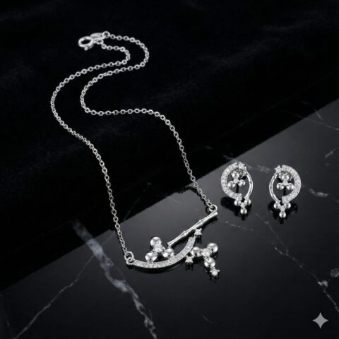 Sterling Silver 925 Blossom Orbit Necklace & Stud Earrings Set with CZ Accents