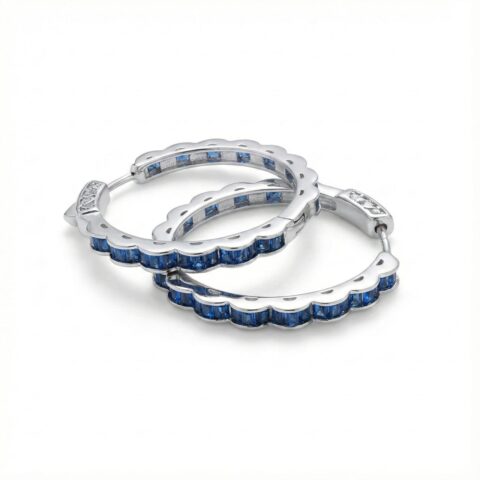 Sterling Silver 925 Blue Baguette Scalloped Hoop Earrings