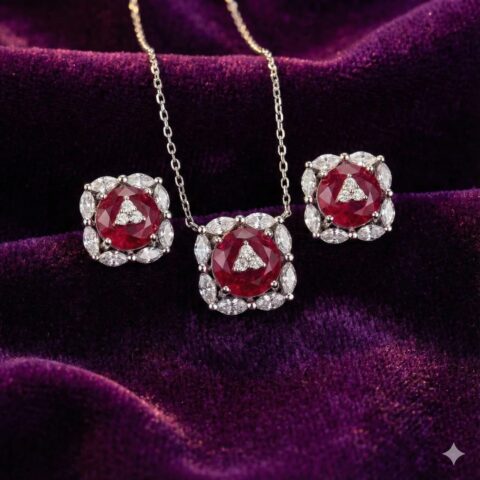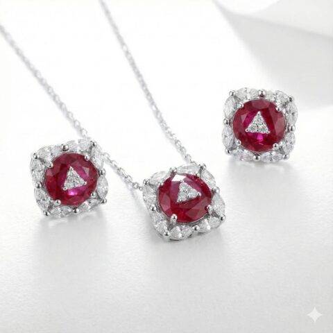 Sterling Silver 925 Cz Ruby Red Halo Necklace & Stud Earrings Set with Marquise CZ Accents