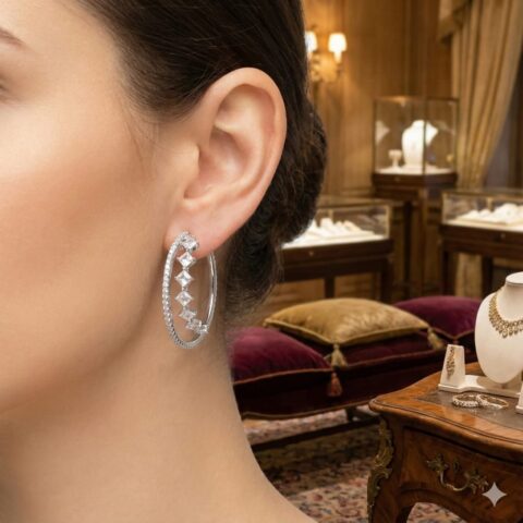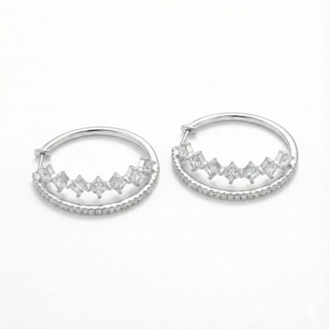 Sterling Silver 925 Double Row Hoop Earrings with Princess & Baguette CZ Stones