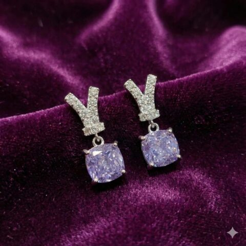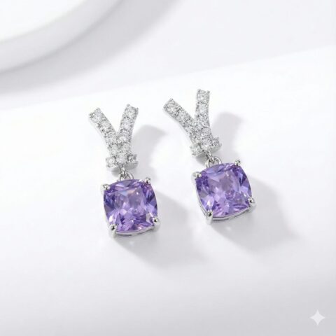 Sterling Silver 925 Elegant Purple Cushion-Cut Drop Earrings with CZ Accents