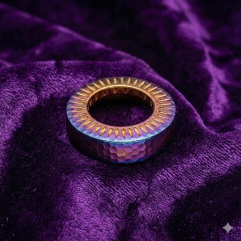 Sterling Silver 925 Fusion Ring – Hammered Rainbow Finish with Geometric Sunburst Detailing