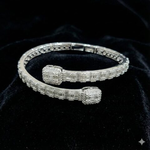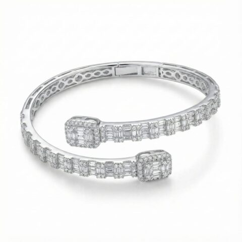 Sterling Silver 925 Open Cuff Bangle with Baguette-Cut CZ Accents