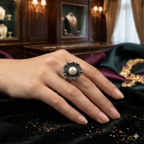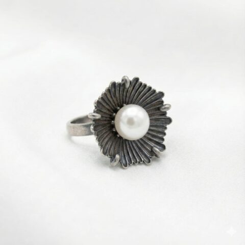 Sterling Silver 925 Oxidized Floral Ring With White Pearl Centre