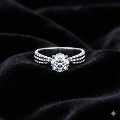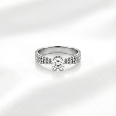 Sterling Silver 925 Oxidized Solitaire Ring with Beaded Band Design