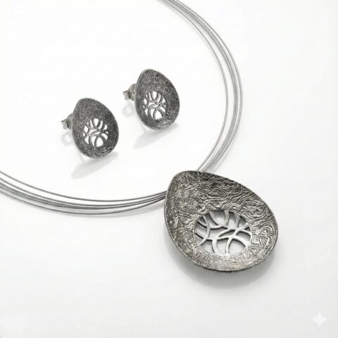 Vintage Textured Silver Teardrop Necklace & Earrings Set with Cut-Out Design