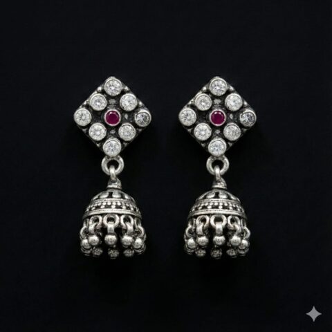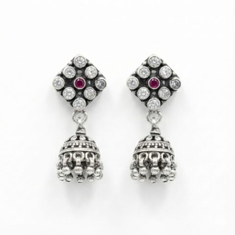 Antique Silver Jhumka Earrings with CZ Crystal & Ruby Accents
