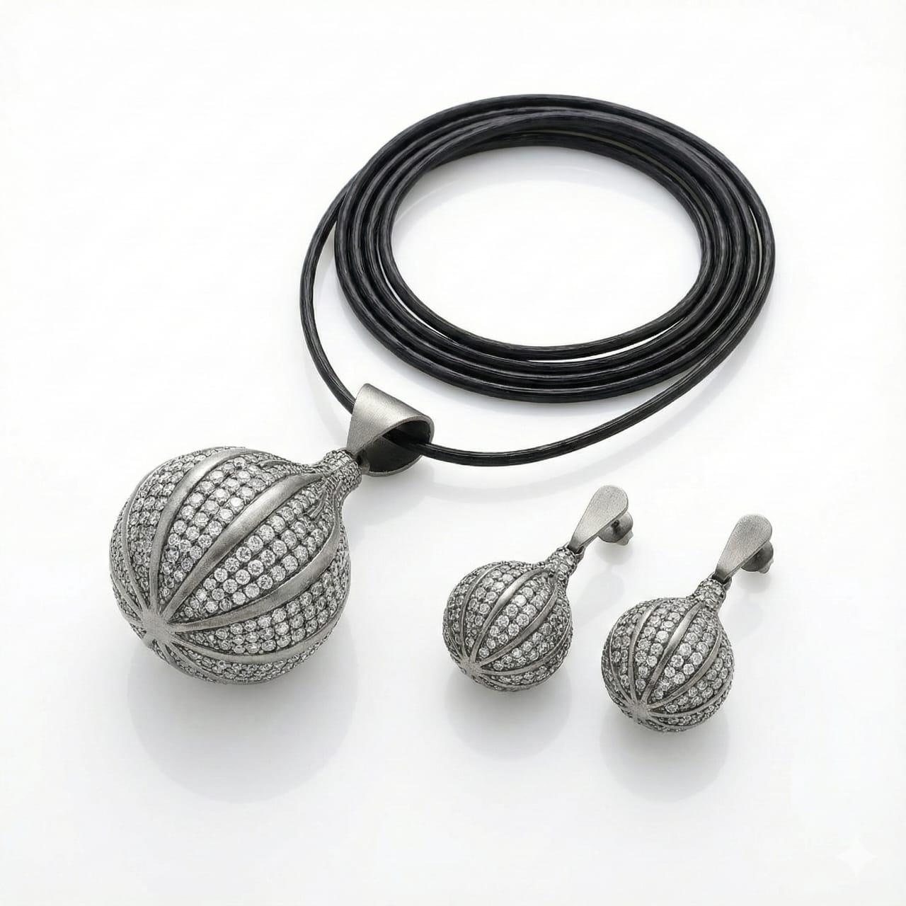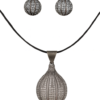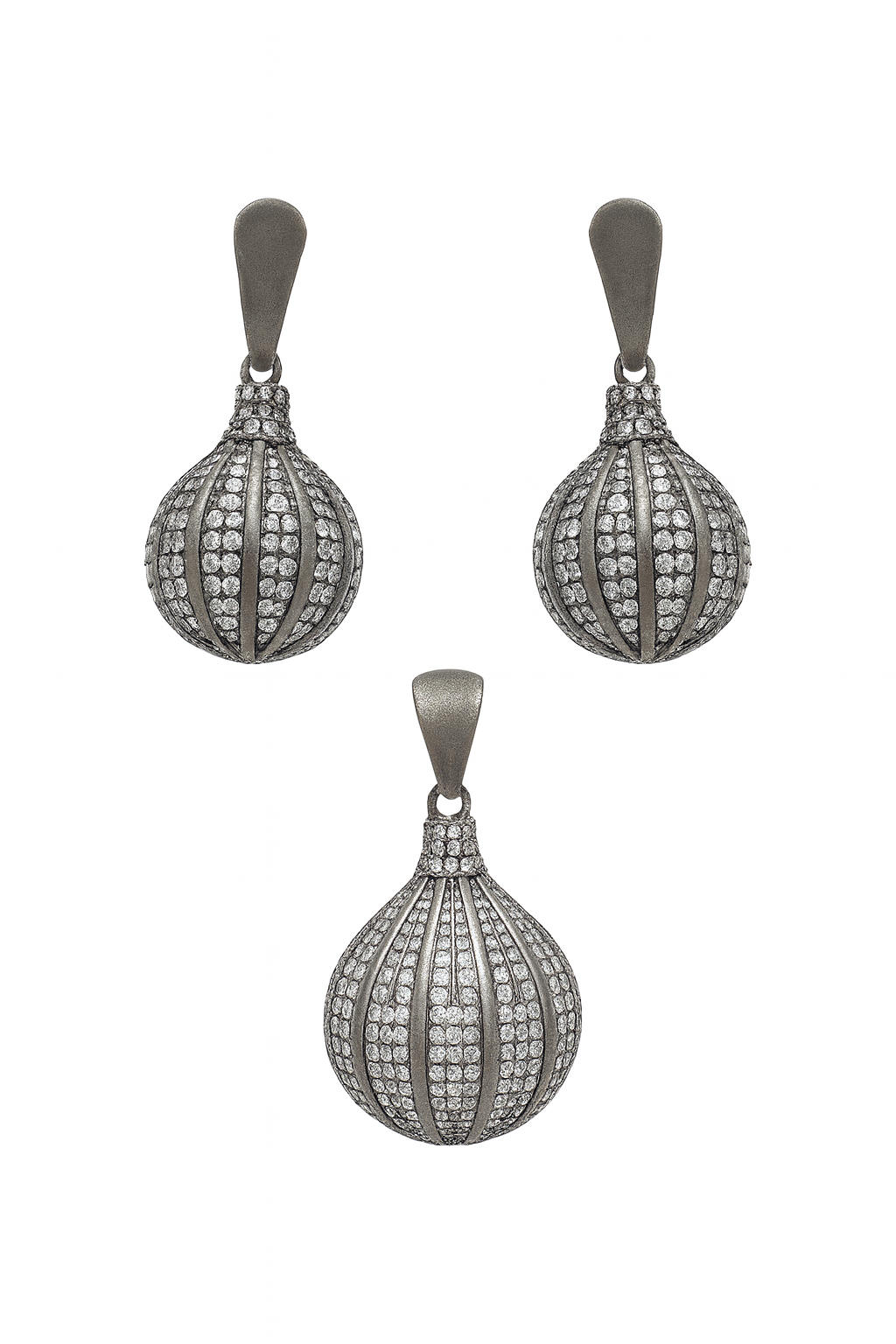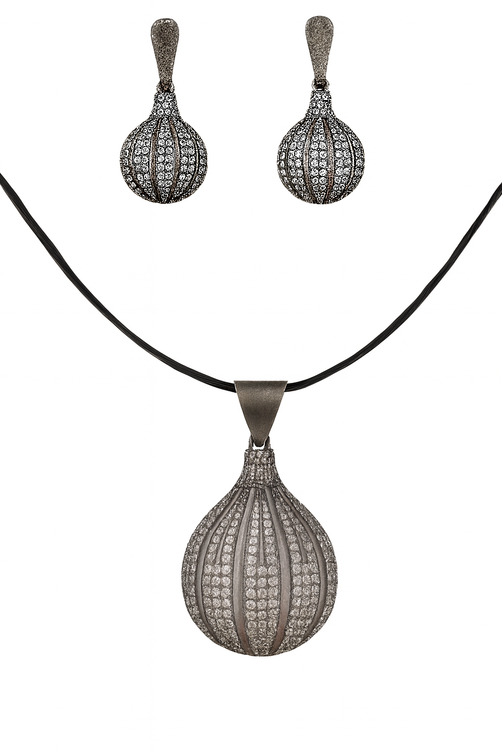 Elevate your jewelry collection with this elegant and eye-catching oxidized sterling silver necklace and earring set. Crafted from 925 sterling silver, the set features a unique bulb-shaped drop pendant and matching earrings, meticulously adorned with high-quality cubic zirconia (CZ) stones in a micro pave setting. The oxidized finish gives it a vintage yet contemporary appeal, perfect for both traditional and modern ensembles.