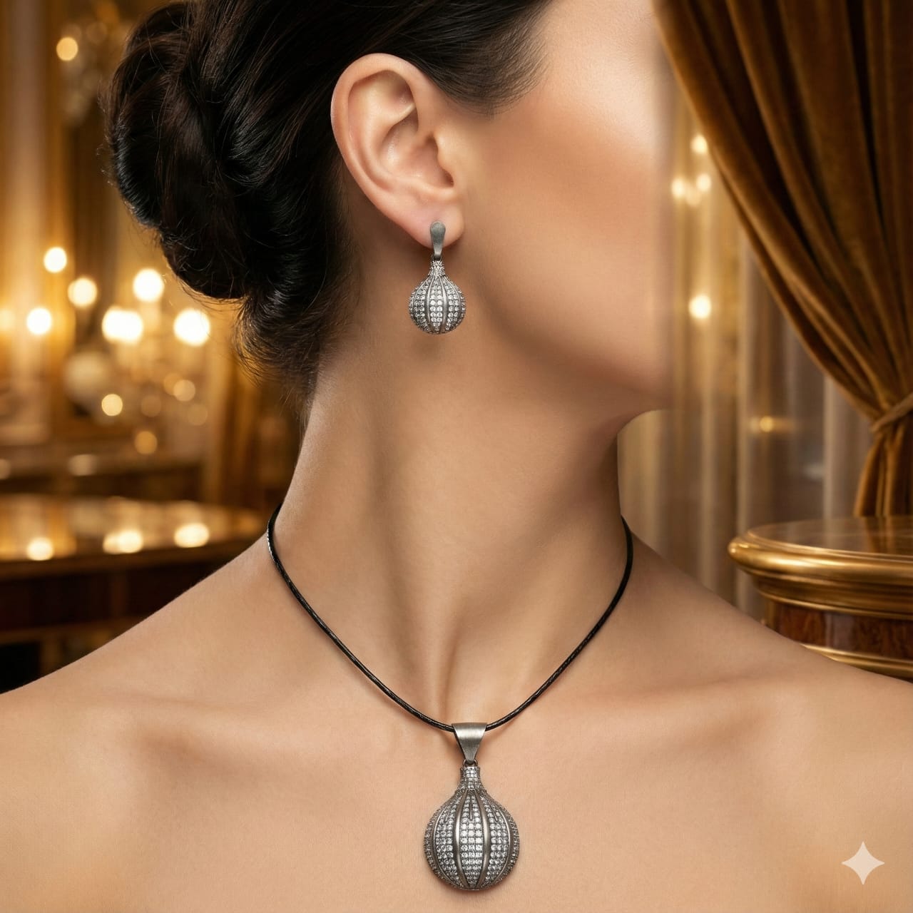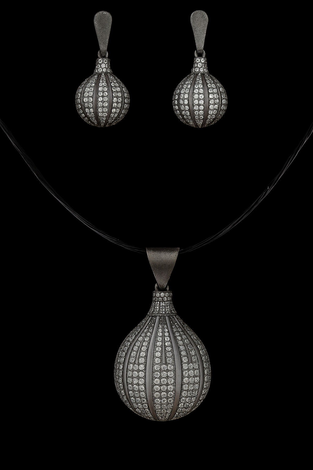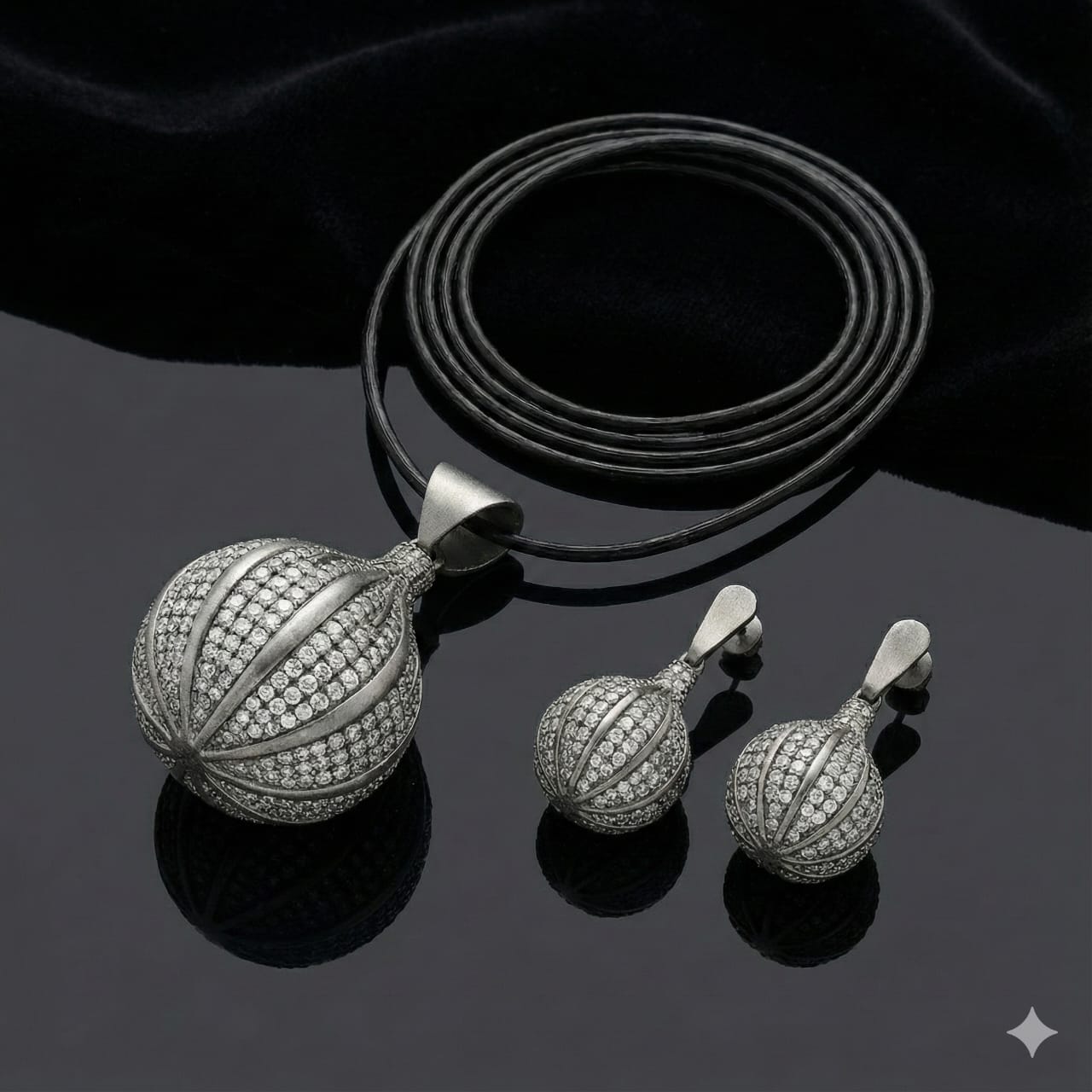 Elevate your jewelry collection with this elegant and eye-catching oxidized sterling silver necklace and earring set. Crafted from 925 sterling silver, the set features a unique bulb-shaped drop pendant and matching earrings, meticulously adorned with high-quality cubic zirconia (CZ) stones in a micro pave setting. The oxidized finish gives it a vintage yet contemporary appeal, perfect for both traditional and modern ensembles.