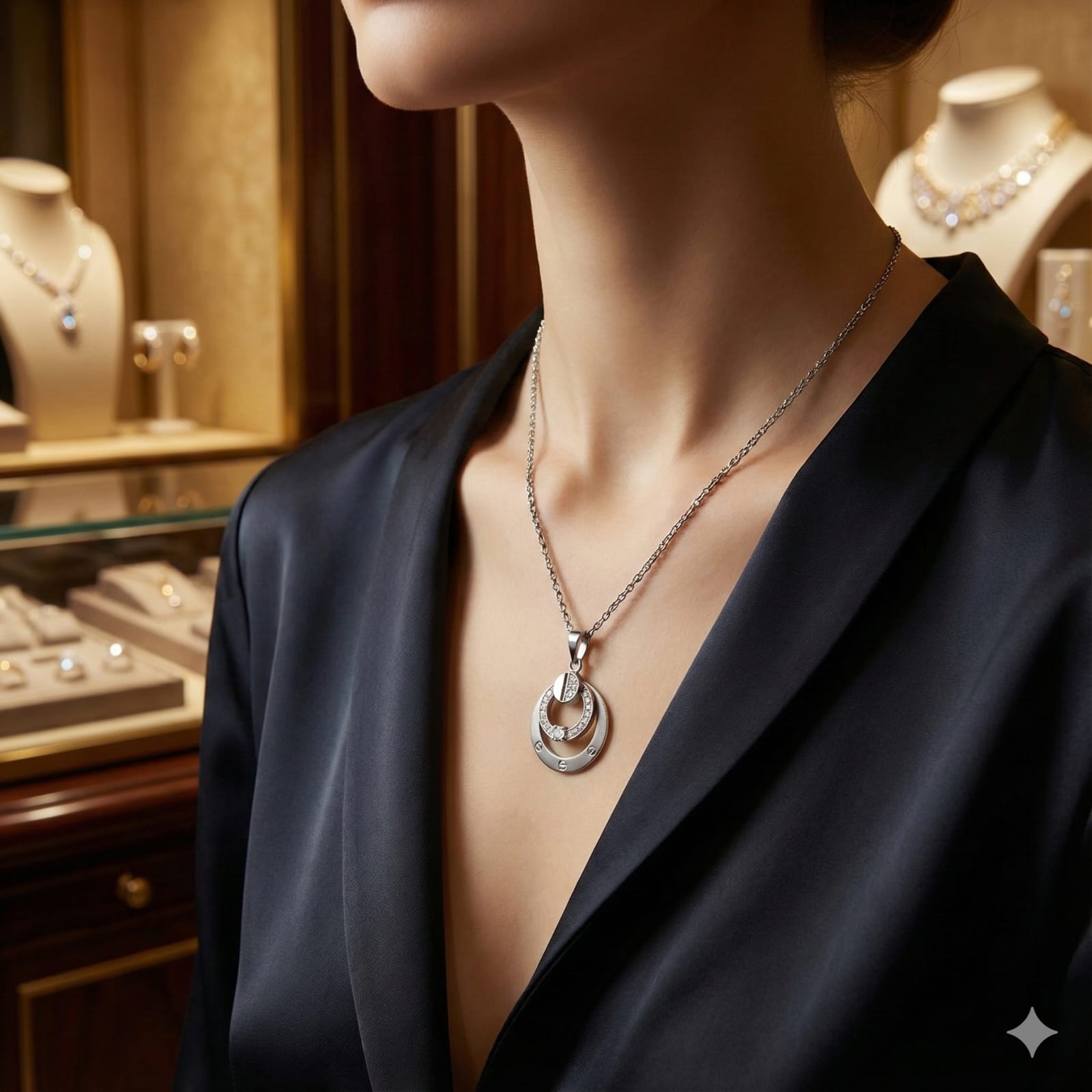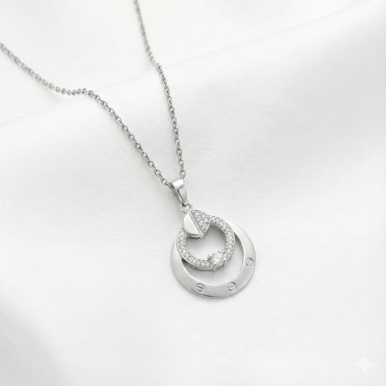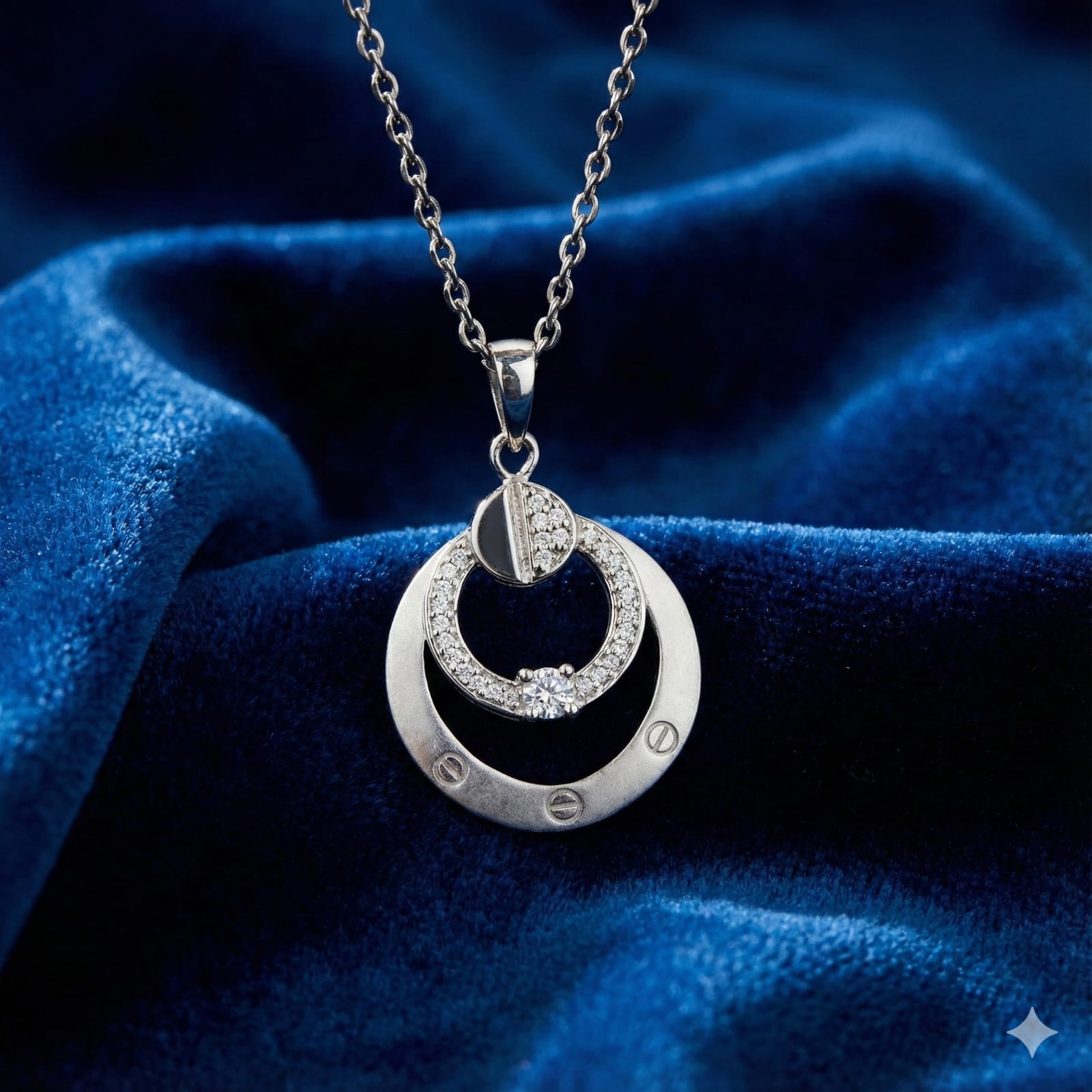 Elevate your everyday elegance with this 925 Sterling Silver Pendant Necklace, featuring a contemporary interlocking circle design accented with sparkling Cubic Zirconia (CZ) stones. The layered circular motif symbolizes unity and timeless style, combining a sleek matte-finish outer ring with a dazzling CZ-studded inner circle. Suspended gracefully from a polished sterling silver chain, this pendant offers a perfect balance of modern minimalism and luxurious sparkle—ideal for both casual wear and special occasions.