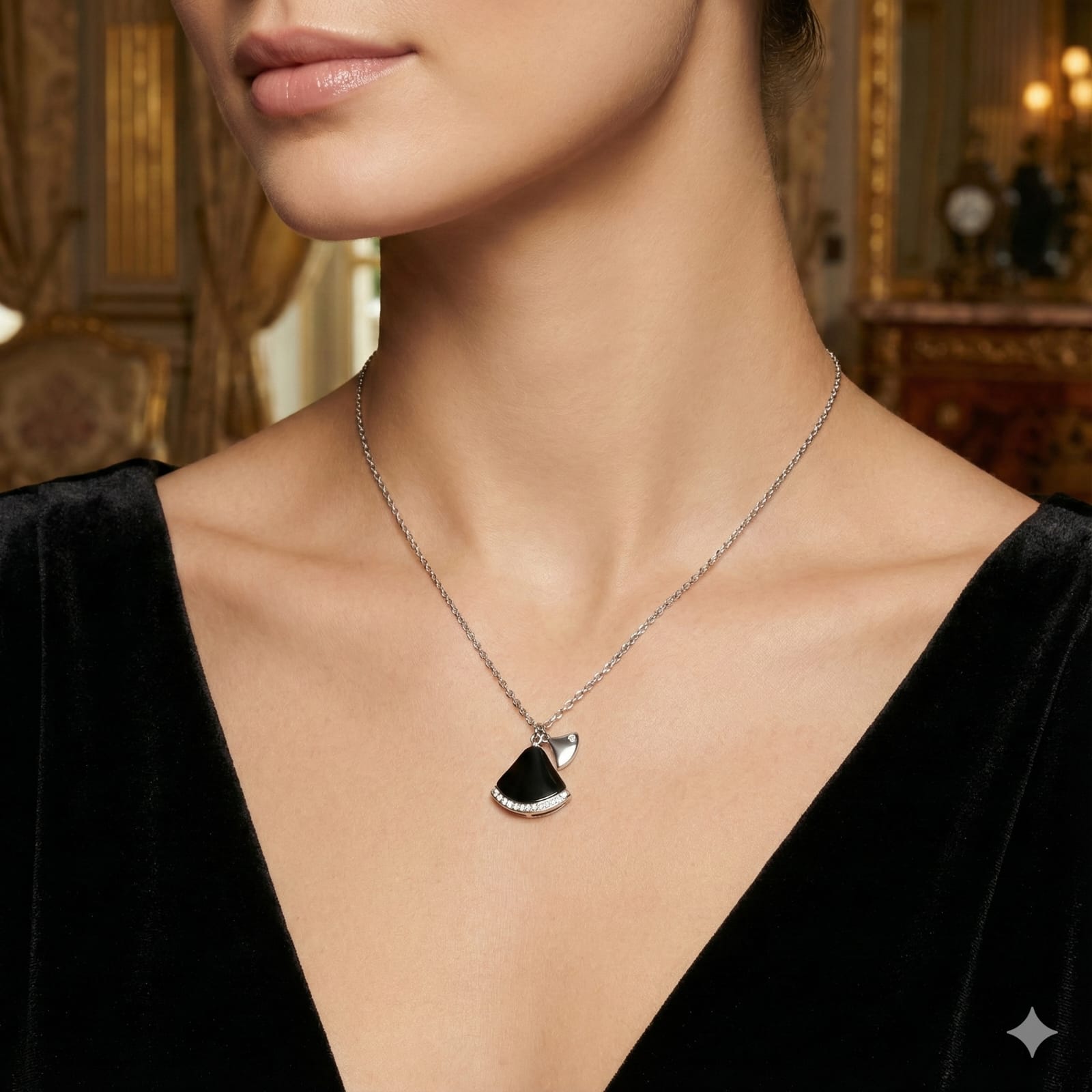 Finish: High-polish silver with black enamel detailing