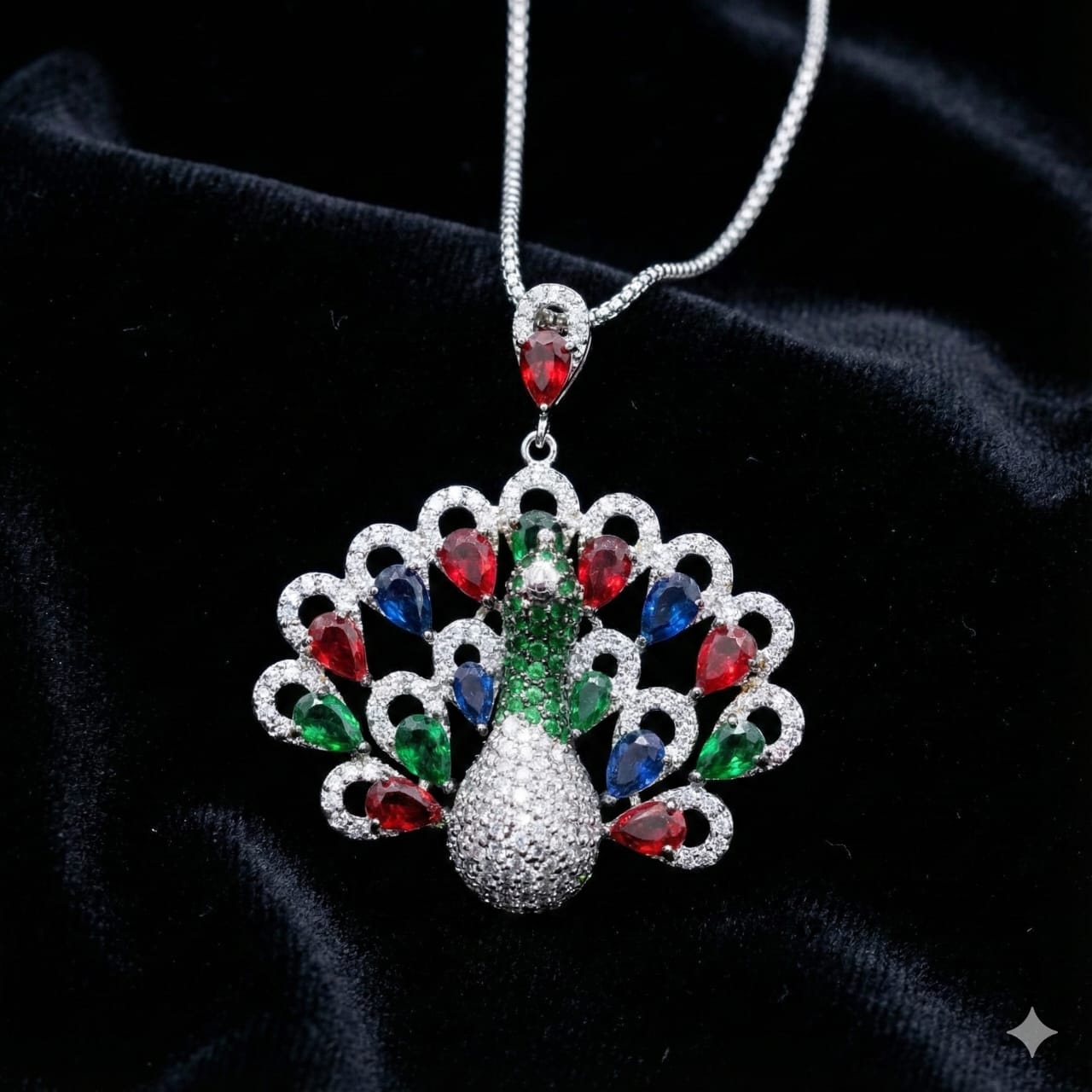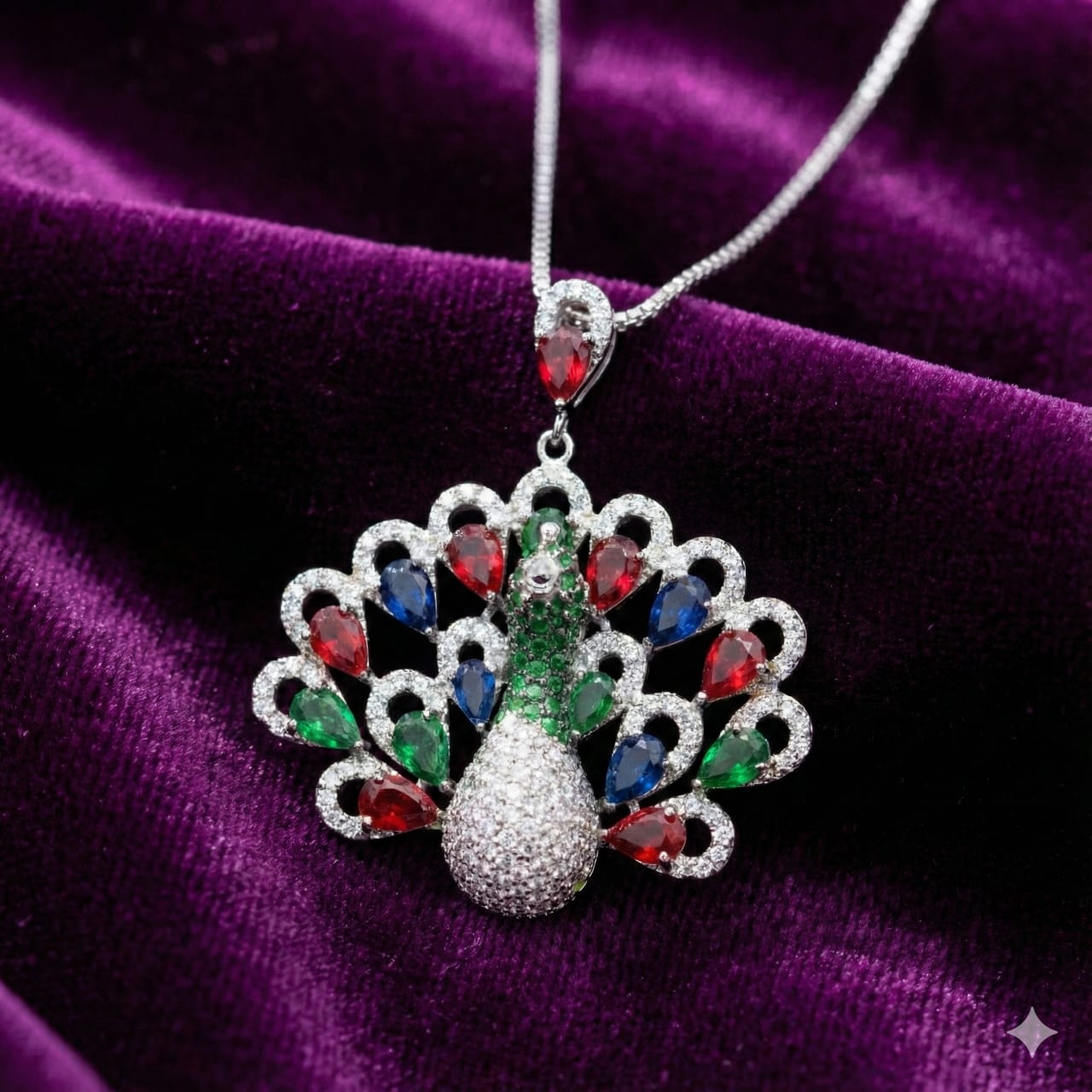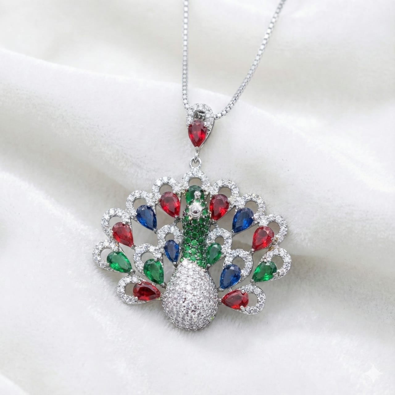 Celebrate elegance inspired by nature with this stunning 925 Sterling Silver Peacock Pendant Necklace. Expertly crafted with intricate detailing, the pendant features a graceful peacock motif adorned with shimmering Cubic Zirconia (CZ) stones in vibrant red, green, blue, and clear tones. The pavé-set CZ body adds luxurious sparkle, while the sleek sterling silver chain completes the look with refined sophistication. Perfect for festive occasions or statement styling, this necklace blends traditional charm with contemporary brilliance.