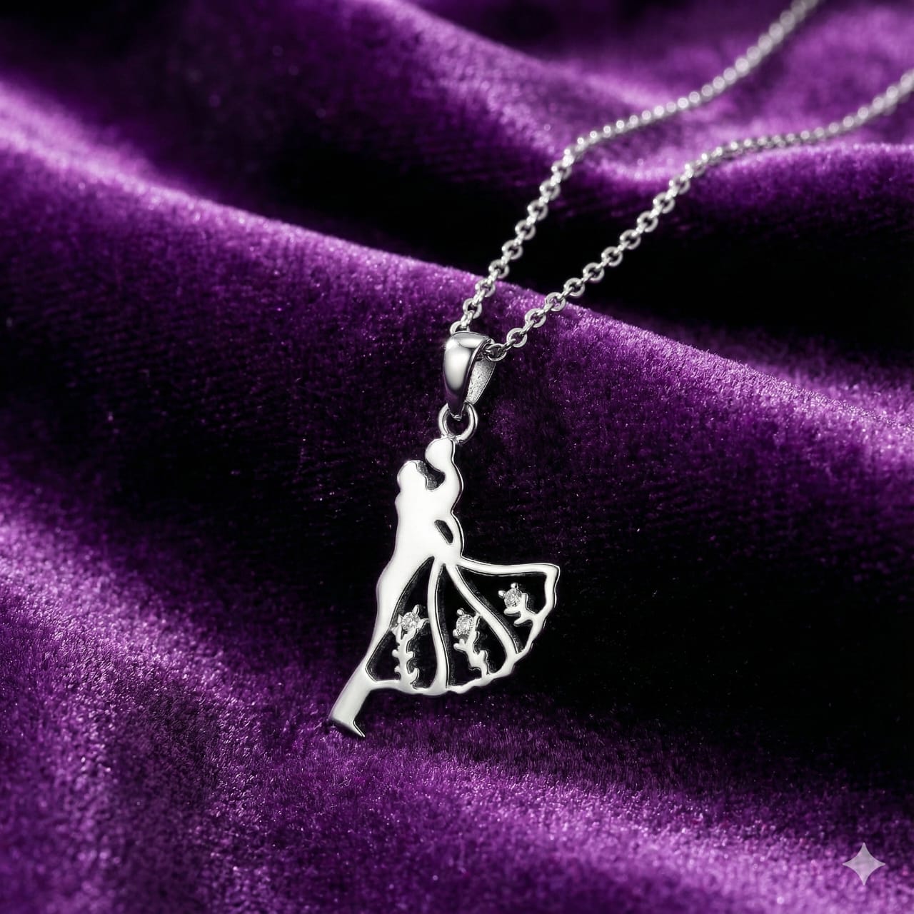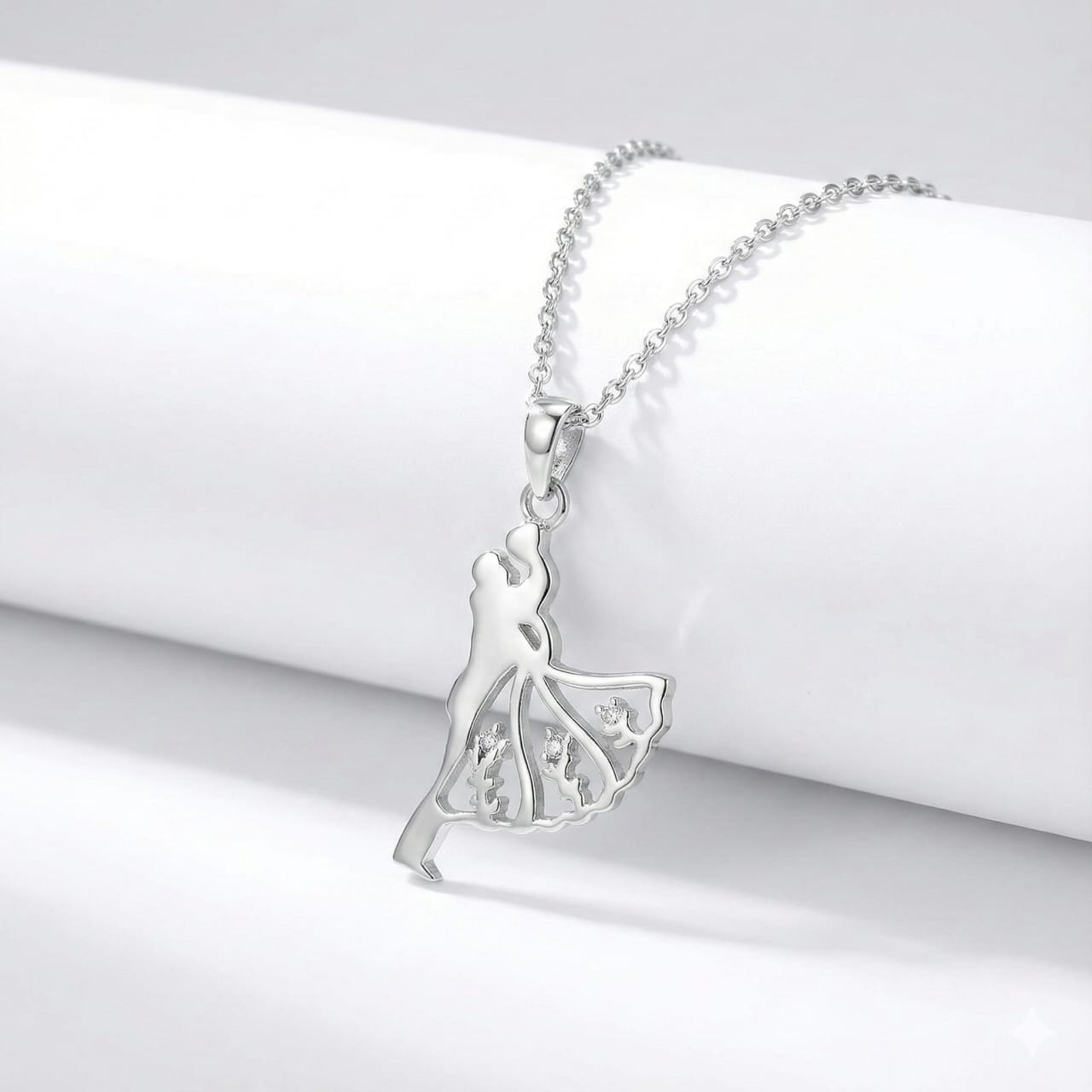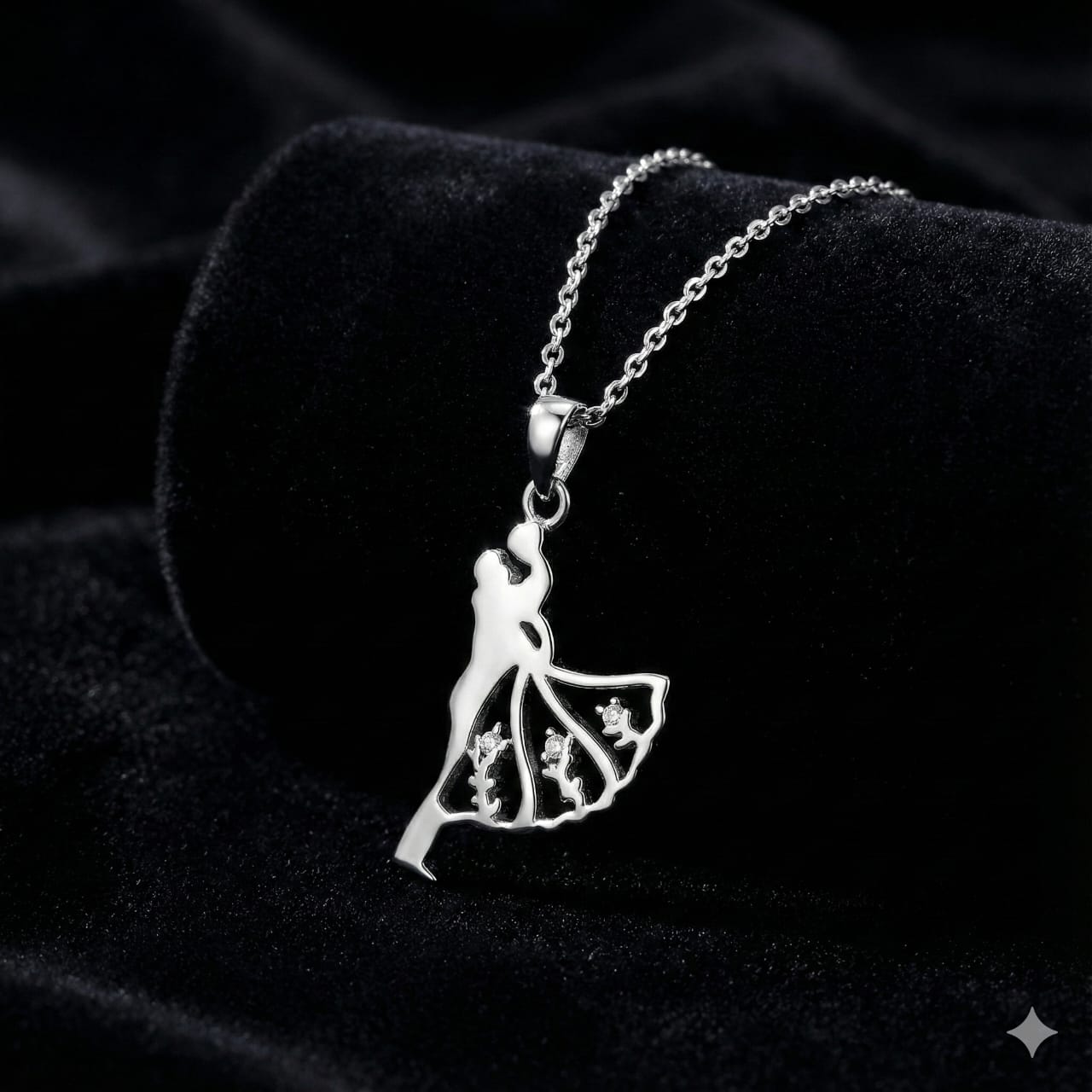 Celebrate timeless romance and graceful elegance with this Sterling Silver 925 pendant featuring a beautifully sculpted dancing couple. The flowing silhouette of the dancer’s gown is adorned with intricate cut-out designs and subtle sparkling accents, creating a delicate yet artistic statement. Crafted from high-quality sterling silver and paired with a classic chain, this necklace is perfect for marking special moments or gifting to a loved one.