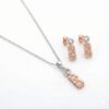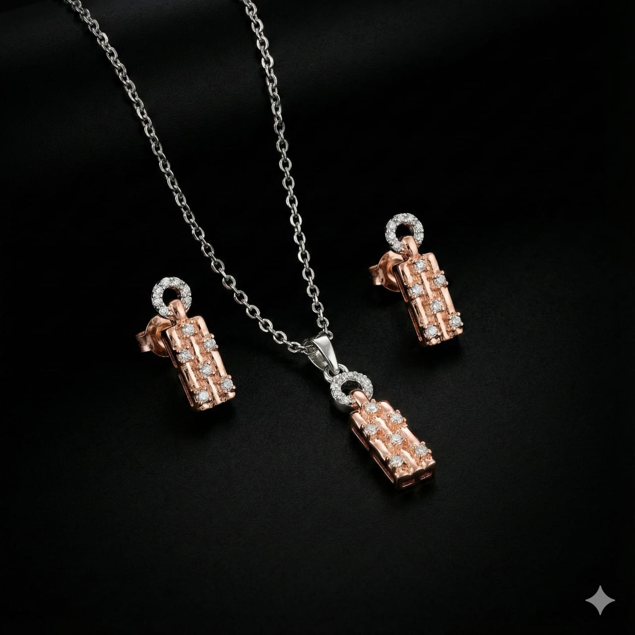 This exquisite jewelry set features a beautifully coordinated pendant necklace and matching earrings, crafted with a luxurious blend of rose gold and silver tones. Each piece showcases a rectangular rose-gold charm adorned with shimmering clear crystals arranged in a refined, modern pattern. The charms are connected to a dazzling crystal-studded circular link, adding an extra touch of brilliance. The pendant hangs from a sleek silver chain, creating a sophisticated contrast that enhances the overall elegance of the set. Perfect for gifting or elevating everyday outfits, this set brings timeless charm and contemporary style together effortlessly.