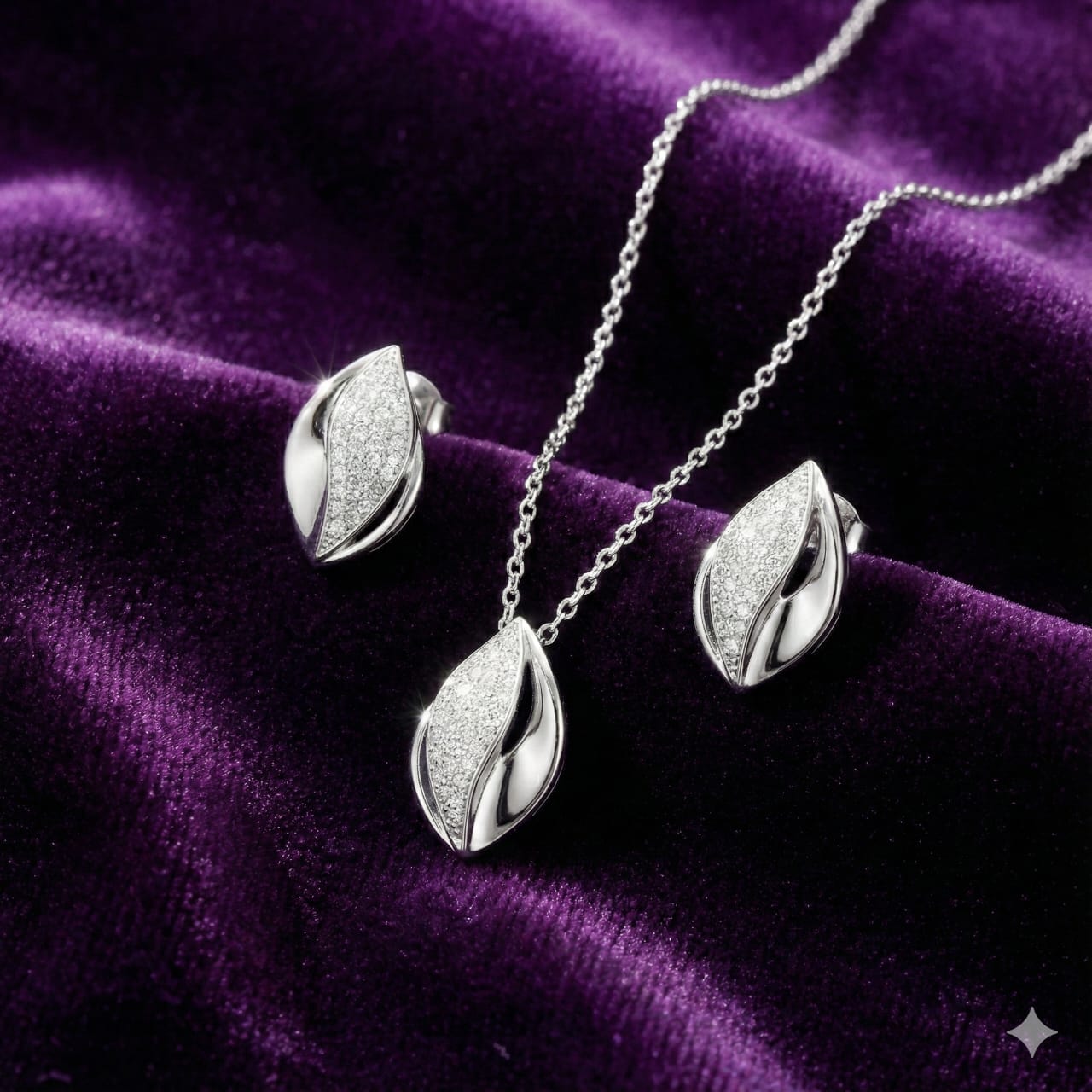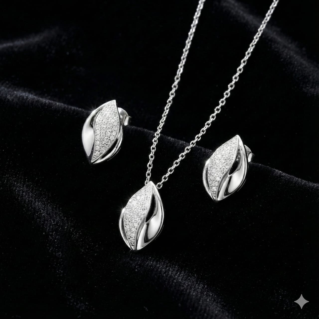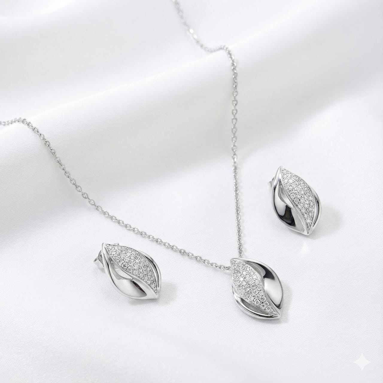 Sterling Silver 925 Leaf-Inspired Jewelry Set with Pave CZ – Necklace & Earrings