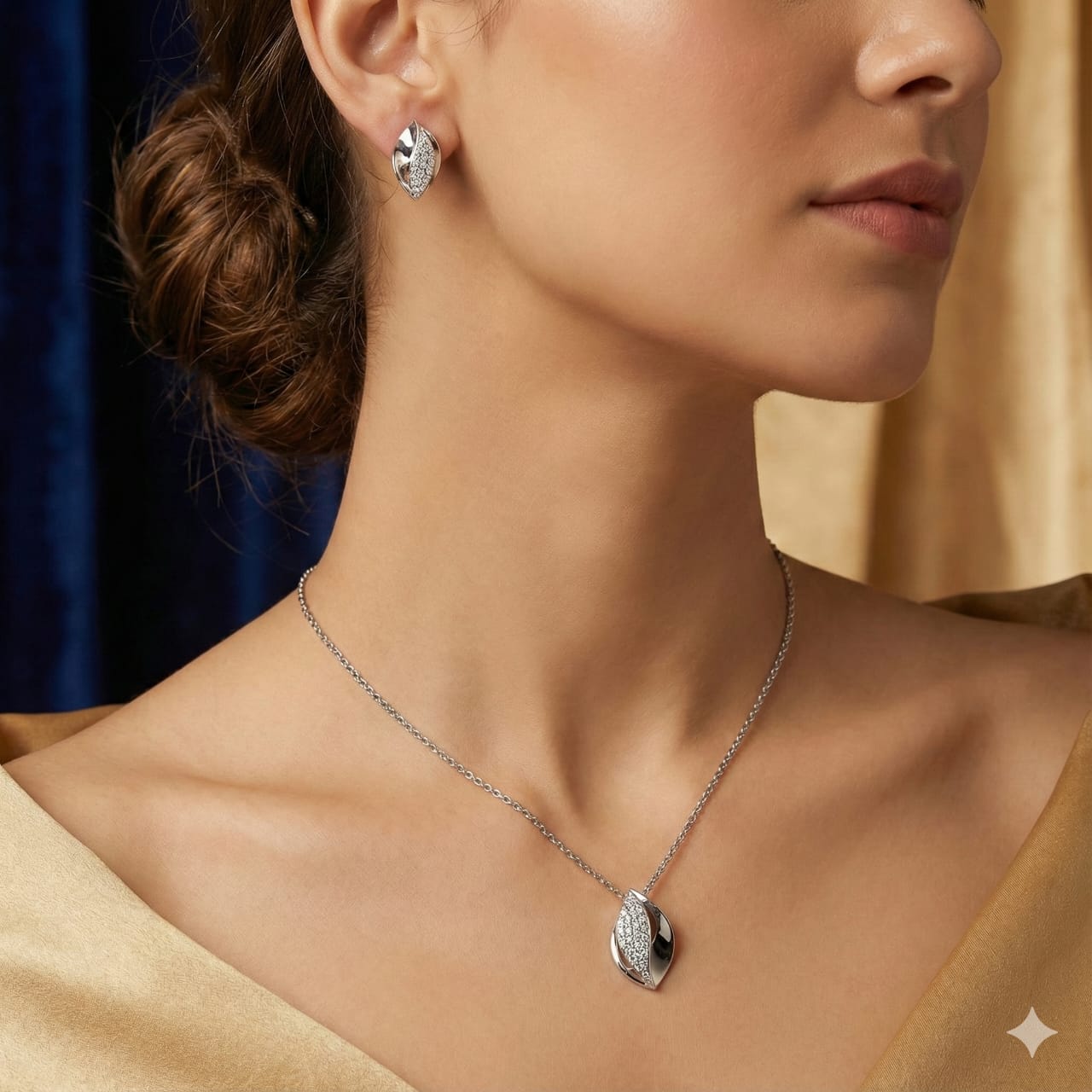 Design Motif: Graceful leaf-shaped pendant and earrings with flowing curves