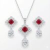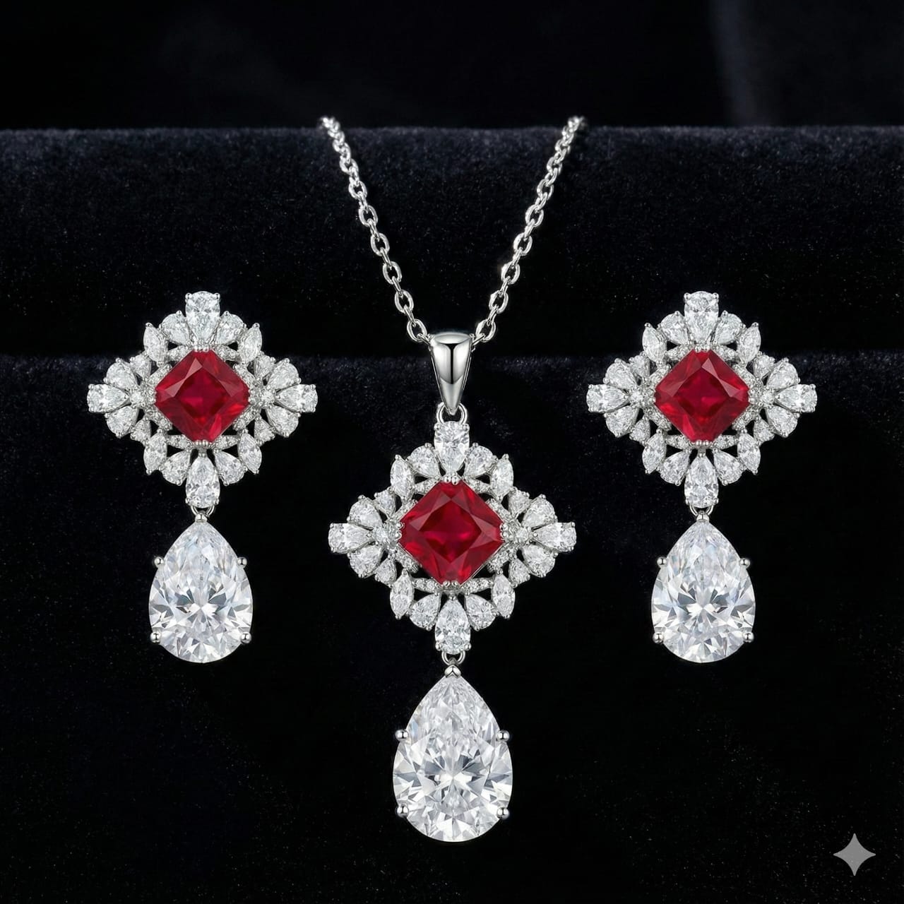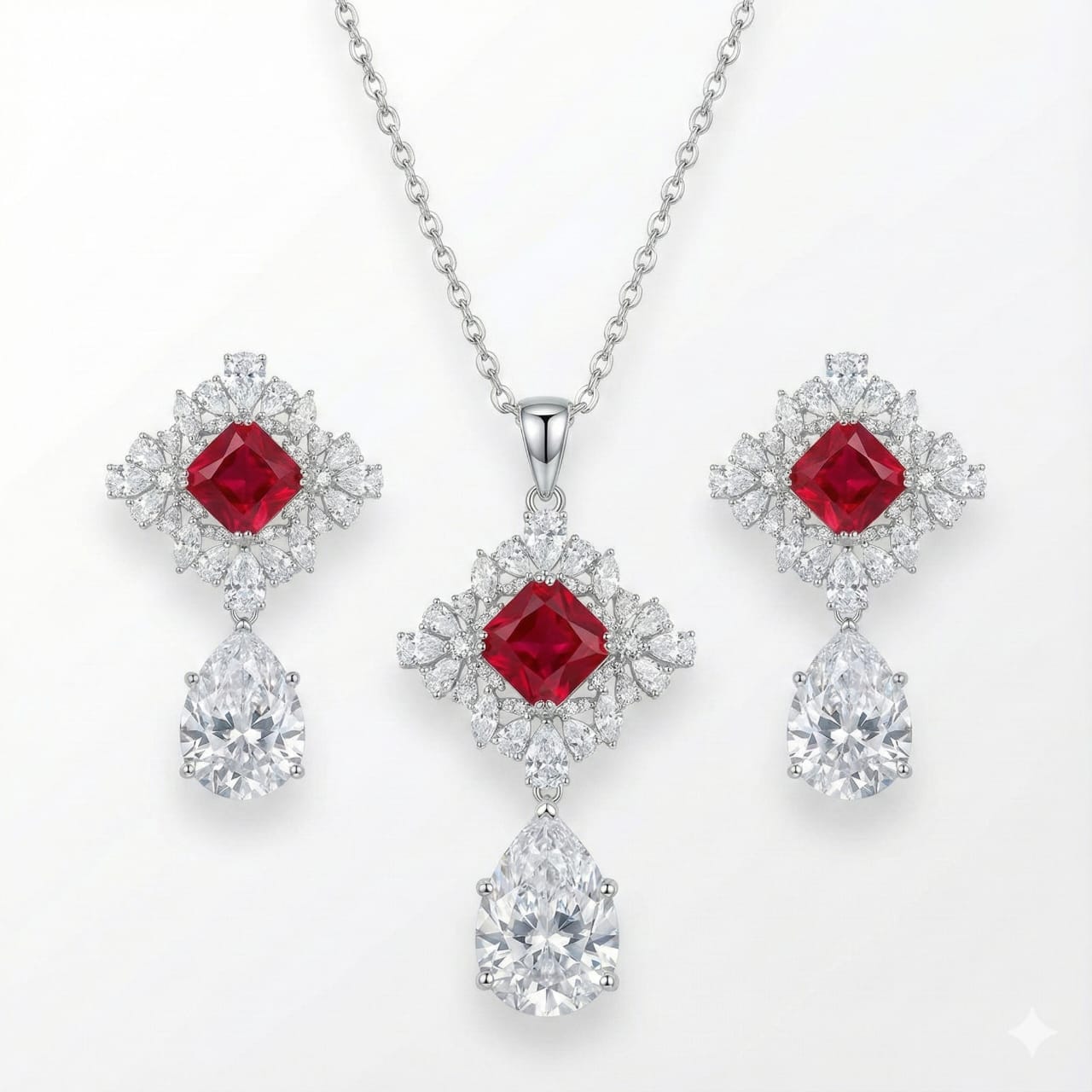 Make a bold and elegant statement with this luxurious Sterling Silver 925 pendant and earring set, featuring a vivid ruby-red princess-cut CZ stone surrounded by a halo of sparkling marquise and round white CZ stones. Finished with a stunning pear-shaped CZ drop, this regal design offers unmatched brilliance and sophistication. Perfect for weddings, festive events, or grand celebrations, this radiant jewelry set is designed to elevate your look with timeless charm.