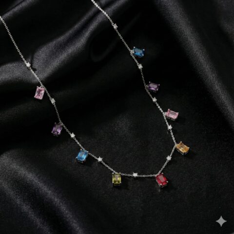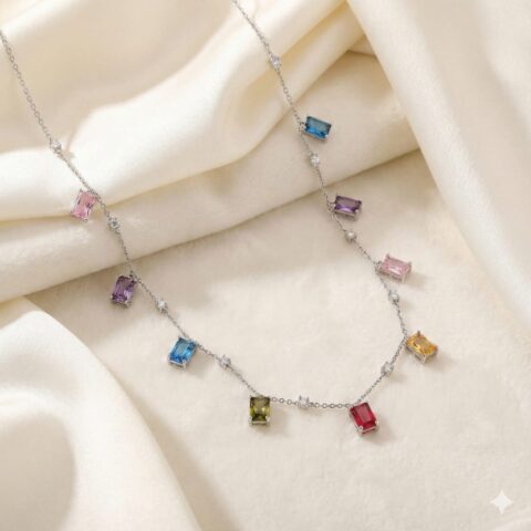 Multi-Color Emerald Cut CZ 925 Sterling Silver Station Necklace