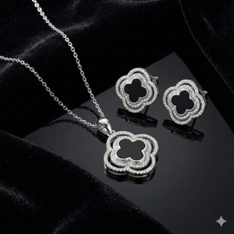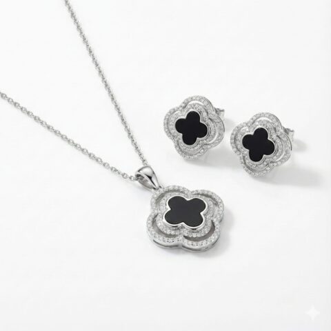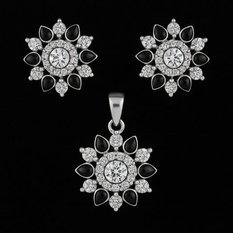 Elegant Silver Floral Pendant & Earrings Set with Black and White Stones – Premium Designer Jewelry for Women