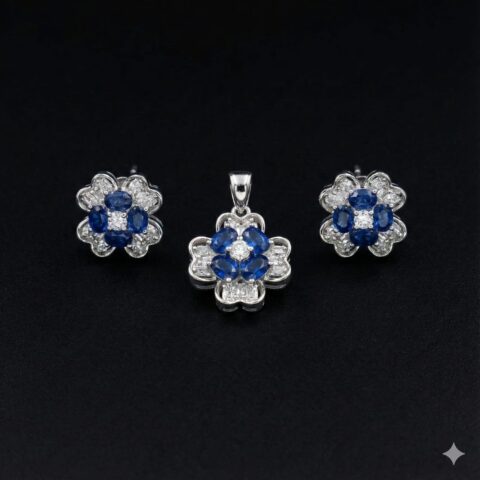 Sterling Silver 925 Blue Stone Floral Pendant & Earring Set