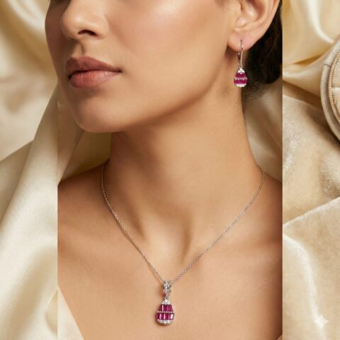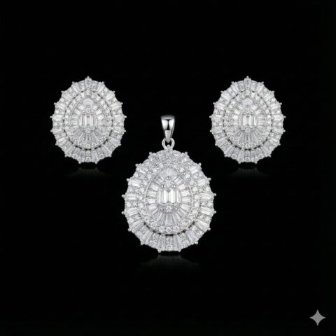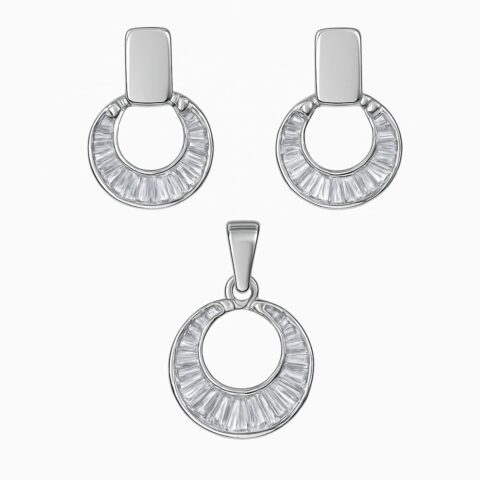 Elegant Silver Heart Pendant & Earrings Set with Baguette and Round Stones – Romantic Designer Jewelry for Women