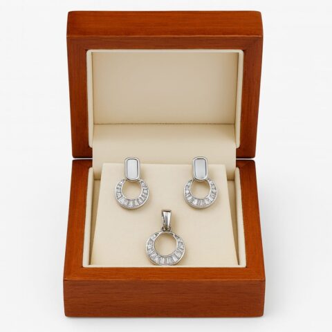 Sterling Silver 925 Mother of Pearl Pendant & Earring Set – Baguette Crystal Halo Design