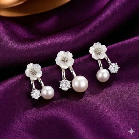 Sterling Silver 925 Pearl & Flower CZ Pendant and Earring Set
