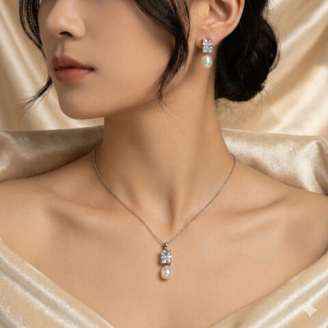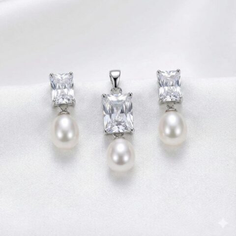 Sterling Silver 925 Rectangle CZ & Pearl Drop Pendant and Earring Set
